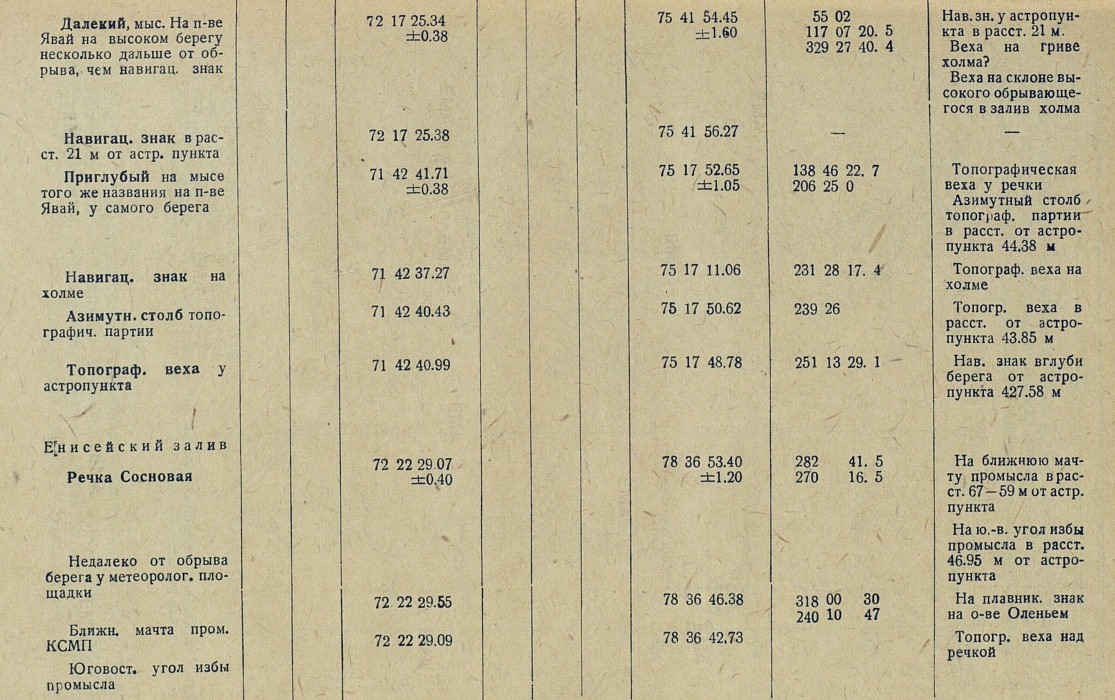 Знак в расстоянии от астропункта 14.9 м 72 20 38.48 76 54 52.66 470 35 57.0 Навигац. знак №11 от астропункта третийДалекий, мыс. На п-ве Явай на высоком берегу несколько дальше от обрыва, чем навигац. знак 72 17 25.34 ±0.38 75 41 54.45 ±1.60 55 02 117 07 20.5 329 27 40.4