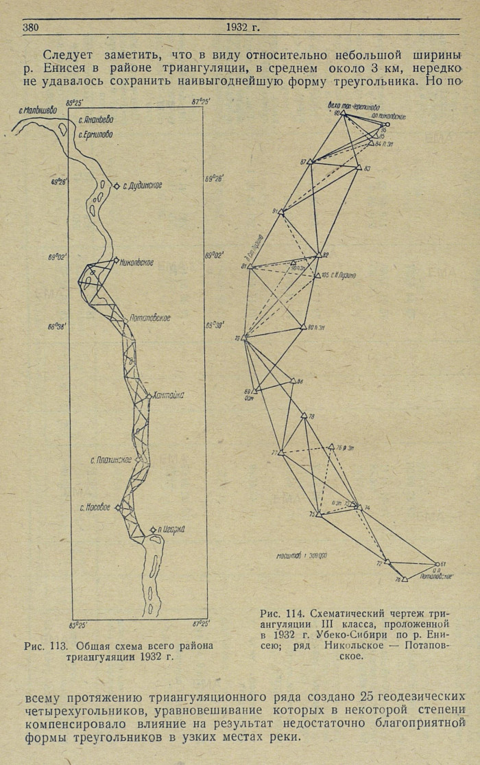 Следует заметить, что в виду относительно небольшой ширины р. Енисея в районе триангуляции, в среднем около 3 км, нередко не удавалось сохранить наивыгоднейшую форму треугольника. Но по
