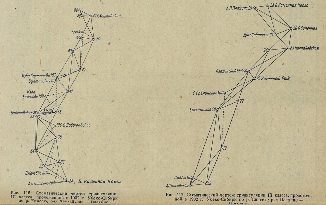 Рис. 116. Схематический чертеж триангуляции III класса, проложенной в 1932 г. Убеко-Сибири по р. Енисею; ряд Хантайское — Плахино.Рис. 117. Схематический чертеж триангуляции III класса, проложенной в 1932 г. Убеко-Сибири по р. Енисею; ряд Плахино — Носовое.[383]