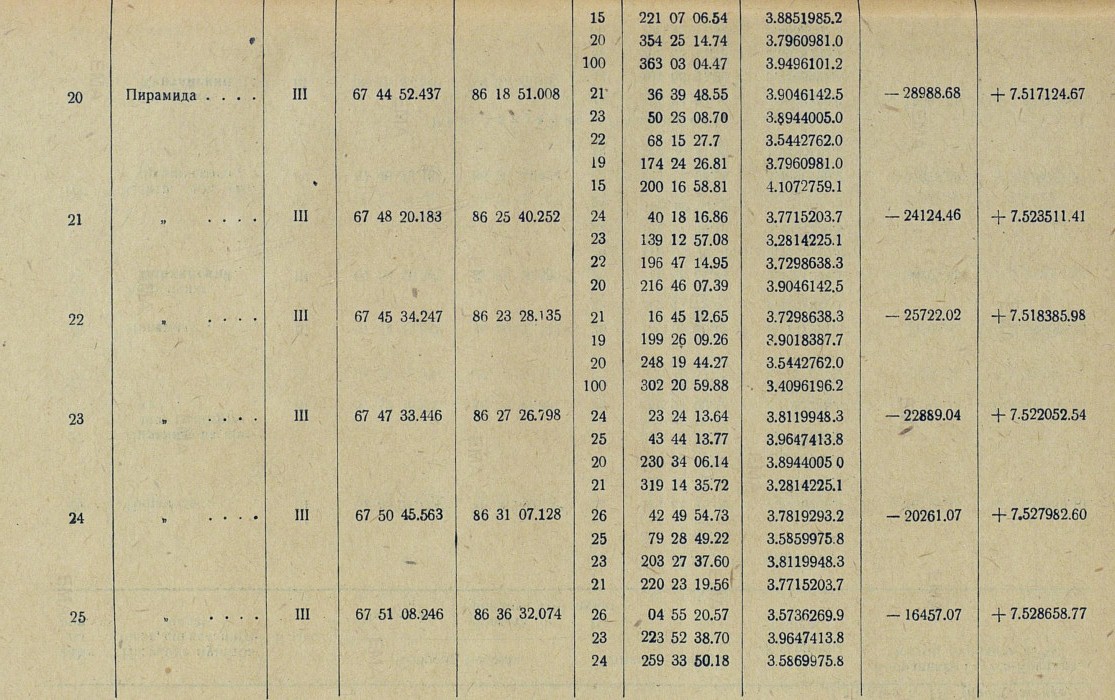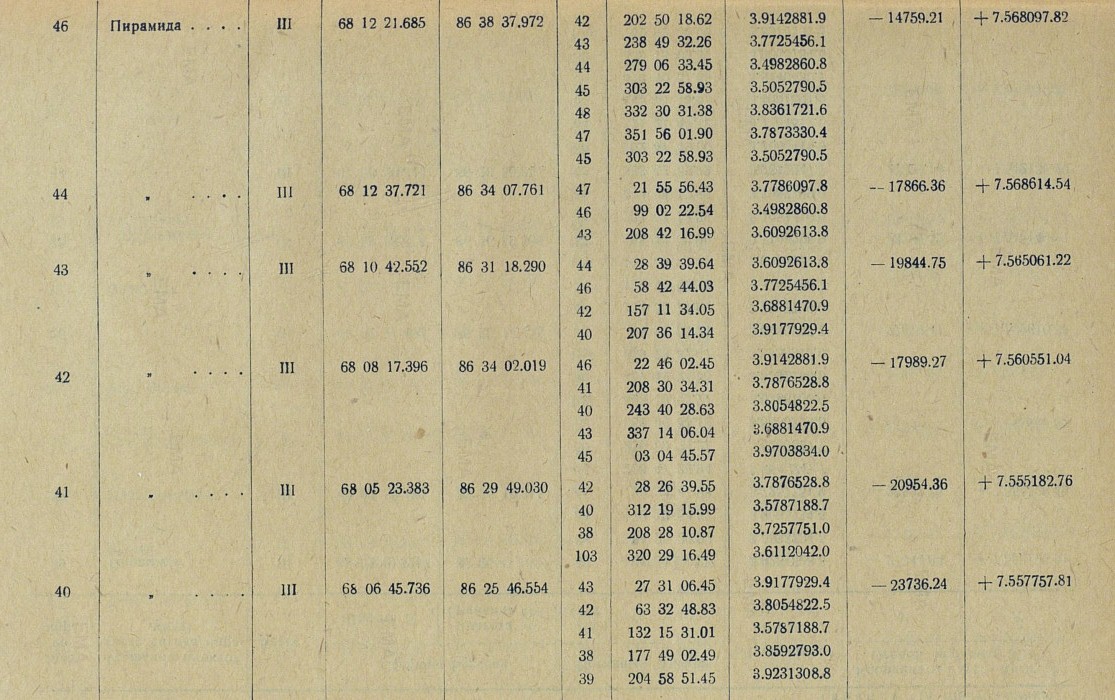 77 Пирамида.... III 68 46 02.148 85 55 26.598 88 06 58 44.62 3.7865628.9 -43496.10 +7.631030.12
