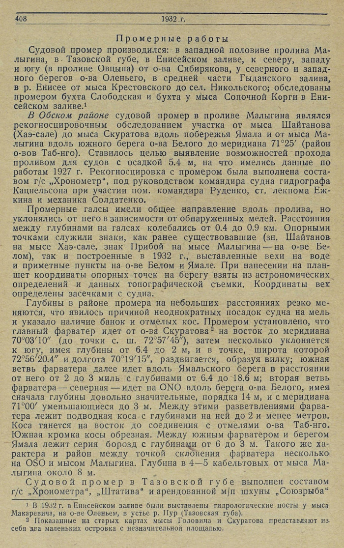 Промерные работыСудовой промер производился: в западной половине пролива Малыгина, в Тазовской губе, в Енисейском заливе, к северу, западу и югу (в проливе Овцына) от о-ва Сибирякова, у северного и западного берегов о-ва Оленьего, в средней части Гыданского залива, в р. Енисее от мыса Крестовского до сел. Никольского; обследованы промером бухта Слободская и бухта у мыса Сопочной Корги в Енисейском заливе. {1}