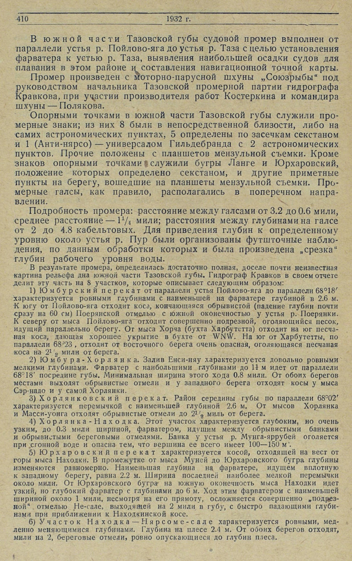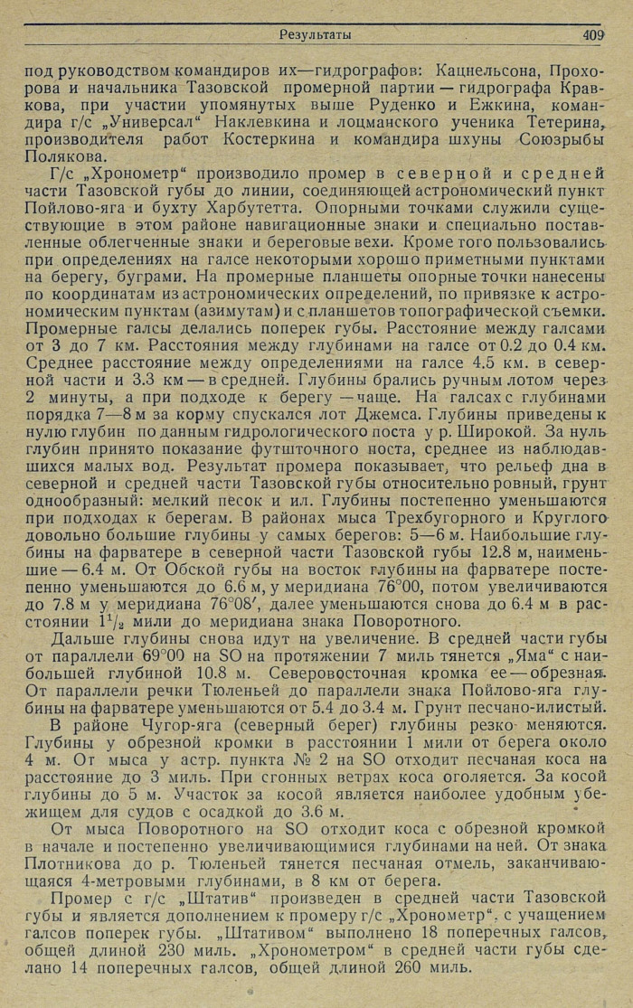 Г/с „Хронометр" производило промер в северной и средней части Тазовской губы до линии, соединяющей астрономический пункт Пойлово-яга и бухту Харбутетта. Опорными точками служили существующие в этом районе навигационные знаки и специально поставленные облегченные знаки и береговые вехи. Кроме того пользовались при определениях на галсе некоторыми хорошо приметными пунктами на берегу, буграми. На промерные планшеты опорные точки нанесены по координатам из астрономических определений, по привязке к астрономическим пунктам (азимутам) и с планшетов топографической съемки. Промерные галсы делались поперек губы. Расстояние между галсами от 3 до 7 км. Расстояния между глубинами на галсе от 0.2 до 0.4 км. Среднее расстояние между определениями на галсе 4.5 км. в северной части и 3.3 км — в средней. Глубины брались ручным лотом через 2 минуты, а при подходе к берегу — чаще. На галсах с глубинами порядка 7—8 м за корму спускался лот Джемса. Глубины приведены к нулю глубин по данным гидрологического поста у р. Широкой. За нуль глубин принято показание футшточного поста, среднее из наблюдавшихся малых вод. Результат промера показывает, что рельеф дна в северной и средней части Тазовской губы относительно ровный, грунт однообразный: мелкий песок и ил. Глубины постепенно уменьшаются при подходах к берегам. В районах мыса Трехбугорного и Круглого довольно большие глубины у самых берегов: 5—6 м. Наибольшие глубины на фарватере в северной части Тазовской губы 12. 8 м, наименьшие — 6.4 м. От Обской губы на восток глубины на фарватере постепенно уменьшаются до 6.6 м, у меридиана 76°00, потом увеличиваются до 7.8 м у меридиана 76°08', далее уменьшаются снова до 6.4 м в расстоянии 1 1/2 мили до меридиана знака Поворотного.