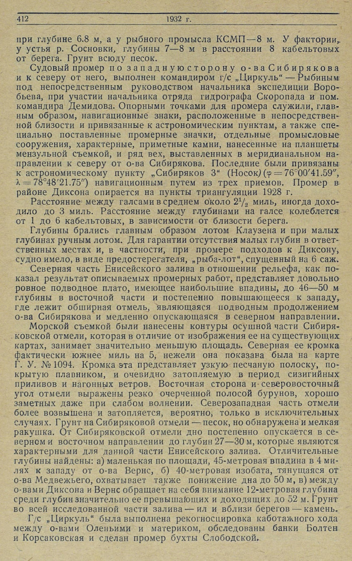 Судовый промер по западную сторону о-ва Сибирякова и к северу от него, выполнен командиром г/с „Циркуль" — Рыбиным под непосредственным руководством начальника экспедиции Воробьева, при участии начальника отряда гидрографа Скоропада и пом. командира Демидова. Опорными точками для промера служили, главным образом, навигационные знаки, расположенные в непосредственной близости и привязанные к астрономическим пунктам, а также специально поставленные промерные значки, отдельные промысловые сооружения, характерные, приметные камни, нанесенные на планшеты мензульной съемкой, и ряд вех, выставленных в меридиональном направлении к северу от о-ва Сибирякова. Последние были привязаны к астрономическому пункту „Сибиряков 3“ (Носок, ) (φ = 76°00'41.59", λ = 78°48'21.75") навигационным путем из трех приемов. Промер в районе Диксона опирается на пункты триангуляции 1928 г.