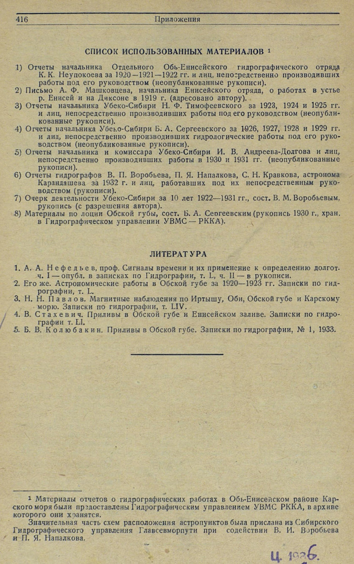 2. Его же. Астрономические работы в Обской губе за 1920—1923 гг. Записки по гидрографии, т. L.