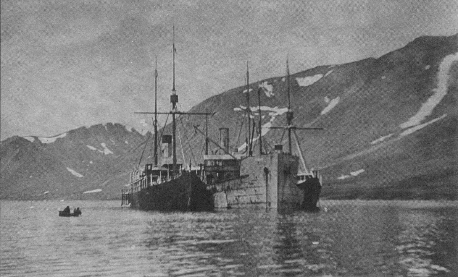 Подъем российского флага на Земле Императора Николая II (Морской сборник. 1915. № 1)Погрузка угля на экспедиционное судно «Таймыр» перед выходом на очередное исследование Северного Ледовитого океана. На левом борту, на месте моторного катера, установлен ящик для хранения гидросамолета в разобранном виде. Владивосток, 1914 год
