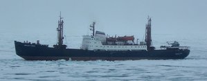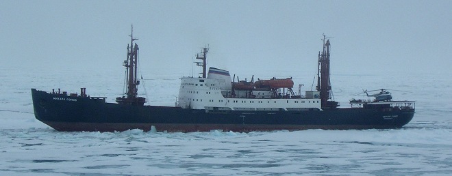 12 июля. 17.30 7950\4533* встретились с НЭС «Михаил Сомов» на кромке сплочённых льдов и начали его проводку. Видимость несколько кабельтовых*, туман. Лёд дрейфует, поэтому координаты места станции постоянно изменяются. Радио России освещает нашу работу. Думаю, что к обеду завтрашнего дня мы подойдём к полярникам. Это 18 часов хода.