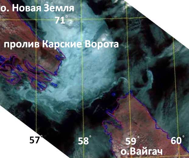 - 5 августа. Так выглядит пролив Карские Ворота из космоса. Красно-коричневым цветом выделена суша: острова Новая Земля и Вайгач. На снимке хорошо просматривается скопление льда в северо-западной части пролива и вдоль Новой Земли. Чистая вода на снимке чёрного цвета, облачность серого. Район Карских Ворот всегда отличается высокой динамикой дрейфа. Снимок был сделан 5 августа утром, а вечером того же дня массив льда полностью перекрыл пролив. Ледоколу пришлось «ковыряться» в этой перемычке с судном за кормой как «ёжику в тумане». Работа такая.