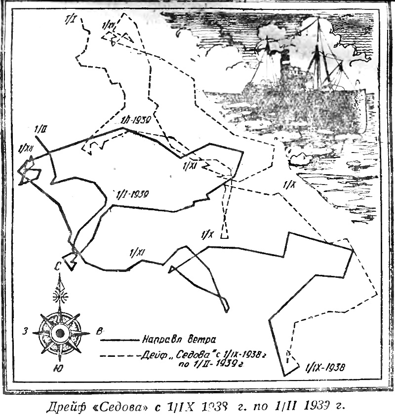 На нашем рисунке (см. стр. 19) изображен дрейф «Седова» с 1 января по 1 февраля 1939 г., а рядом показаны стрелками соответствующее направление и относительная сила ветра между отдельными отрезками дрейфа. Масштаб скорости дрейфа и скорости ветра принят согласно второму правилу Нансена (т. е. скорость дрейфа в 50 раз меньше скорости ветра). Из рисунка видно, насколько хорошо оба правила Нансена подтверждаются дрейфом «Седова». При каждом изменении ветра немедленно изменяется в соответствующую сторону и направление дрейфа «Седова». Неудивительно поэтому, что дрейф «Седова», подобно всем предыдущим дрейфам со льдами, не проходит и не будет проходить прямолинейно. «Седов» то идет в одном направлении, то возвращается обратно, то описывает причудливые петли* и зигзаги, и все это связано с соответствующими изменениями в направлении и скорости ветра. Если в некоторых точках дрейфа и получаются некоторые расхождения с правилами Нансена, то это надо скорее объяснить неточностью наблюдений, вернее, неполнотой дошедших до нас сведений, чем существом дела.