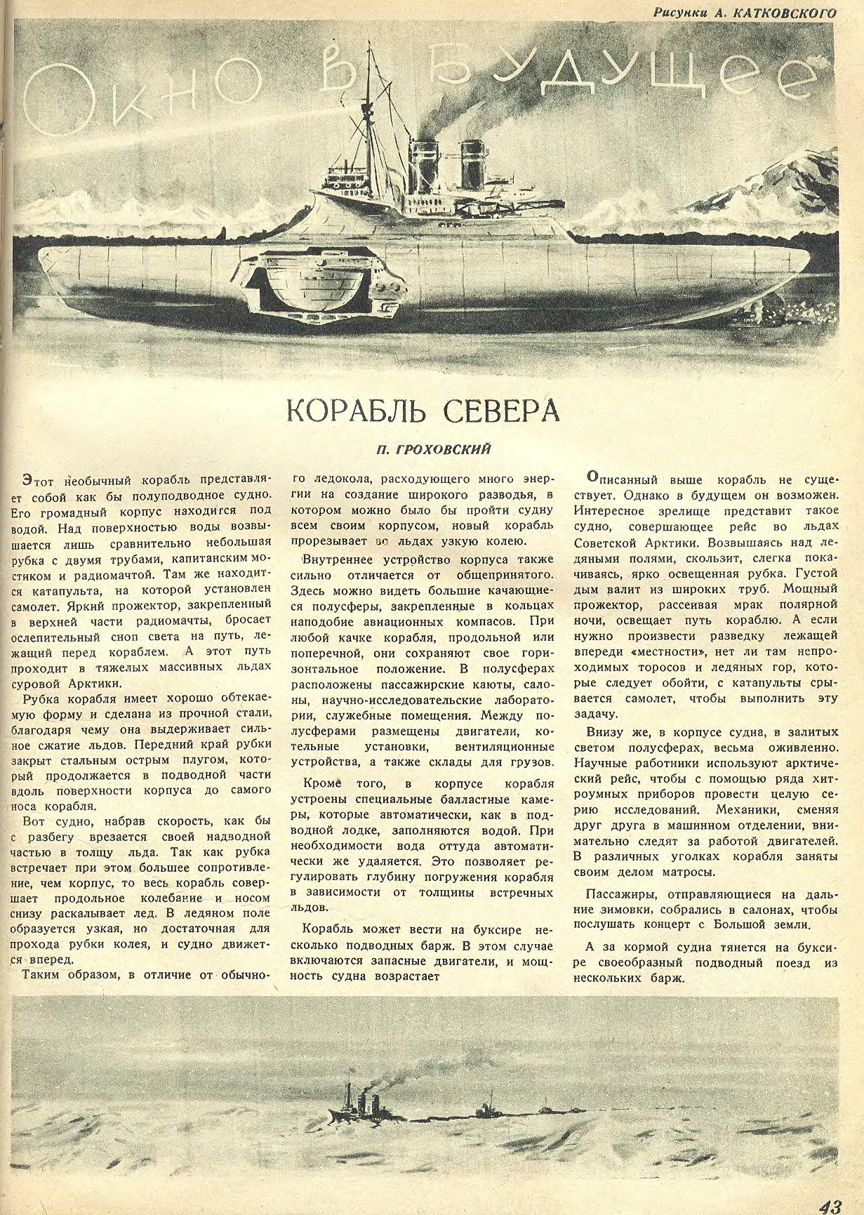 Описанный выше корабль не существует. Однако в будущем он возможен. Интересное зрелище представит такое судно, совершающее рейс во льдах Советской Арктики. Возвышаясь над ледяными полями, скользит, слегка покачиваясь, ярко освещенная рубка. Густой дым валит из широких труб. Мощный прожектор, рассеивая мрак полярной ночи, освещает путь кораблю. А если нужно произвести разведку лежащей впереди «местности», нет ли там непроходимых торосов и ледяных гор, которые следует обойти, с катапульты срывается самолет, чтобы выполнить эту задачу.