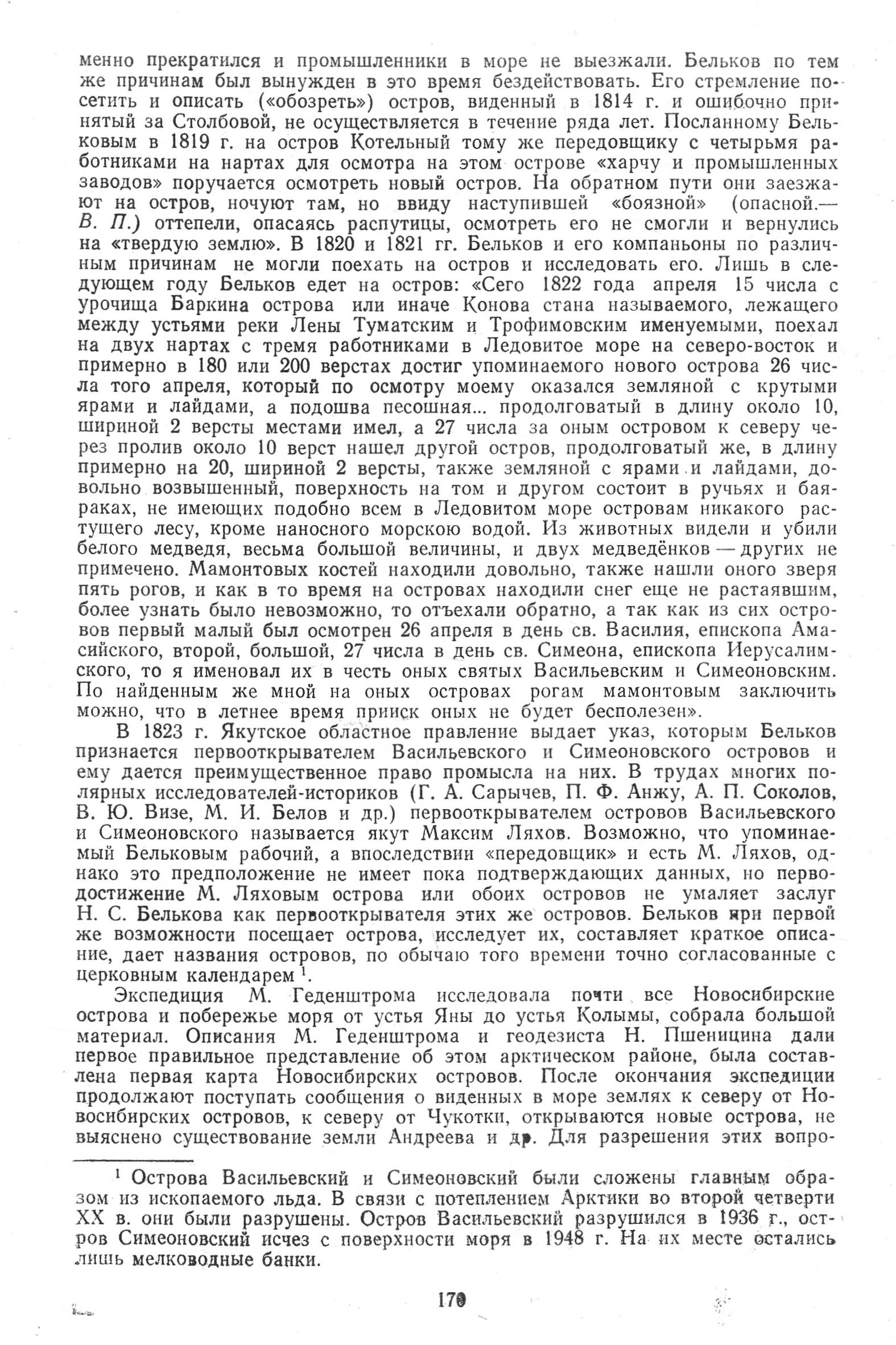 менно прекратился и промышленники в море не выезжали. Бельков по тем же причинам был вынужден в это время бездействовать. Его стремление посетить и описать («обозреть») остров, виденный в 1814 г. и ошибочно принятый за Столбовой, не осуществляется в течение ряда лет. Посланному Бельковым в 1819 г. на остров Котельный тому же передовщику с четырьмя работниками на нартах для осмотра на этом острове «харчу и промышленных заводов» поручается осмотреть новый остров. На обратном пути они заезжают на остров, ночуют там, но ввиду наступившей «боязной» (опасной. — В. П.) оттепели, опасаясь распутицы, осмотреть его не смогли и вернулись на «твердую землю». В 1820 и 1821 гг. Бельков и его компаньоны по различным причинам не могли поехать на остров и исследовать его. Лишь в следующем году Бельков едет на остров: «Сего 1822 года апреля 15 числа с урочища Баркина острова или иначе Конова стана называемого, лежащего между устьями реки Лены Туматским и Трофимовским именуемыми, поехал на двух нартах с тремя работниками в Ледовитое море на северо-восток и примерно в 180 или 200 верстах достиг упоминаемого нового острова 26 числа того апреля, который по осмотру моему оказался земляной с крутыми ярами и лайдами, а подошва песошная... продолговатый в длину около 10, шириной 2 версты местами имел, а 27 числа за оным островом к северу через пролив около 10 верст нашел другой остров, продолговатый же, в длину примерно на 20, шириной 2 версты, также земляной с ярами, и лайдами, довольно возвышенный, поверхность на том и другом состоит в ручьях и баяраках, не имеющих подобно всем в Ледовитом море островам никакого растущего лесу, кроме наносного морского водой. Из животных видели и убили белого медведя, весьма большой величины, и двух медведёнков — других не примечено. Мамонтовых костей находили довольно, также нашли оного зверя пять рогов, и как в то время на островах находили снег еще не растаявшим, более узнать было невозможно, то отъехали обратно, а так как из сих островов первый малый был осмотрен 26 апреля в день св. Василия, епископа Амасийского, второй, большой, 27 числа в день св. Симеона, епископа Иерусалимского, то я именовал их в честь оных святых Васильевским и Симеоновским. По найденным же мной на оных островах рогам мамонтовым заключить можно, что в летнее время прииск оных не будет бесполезен».