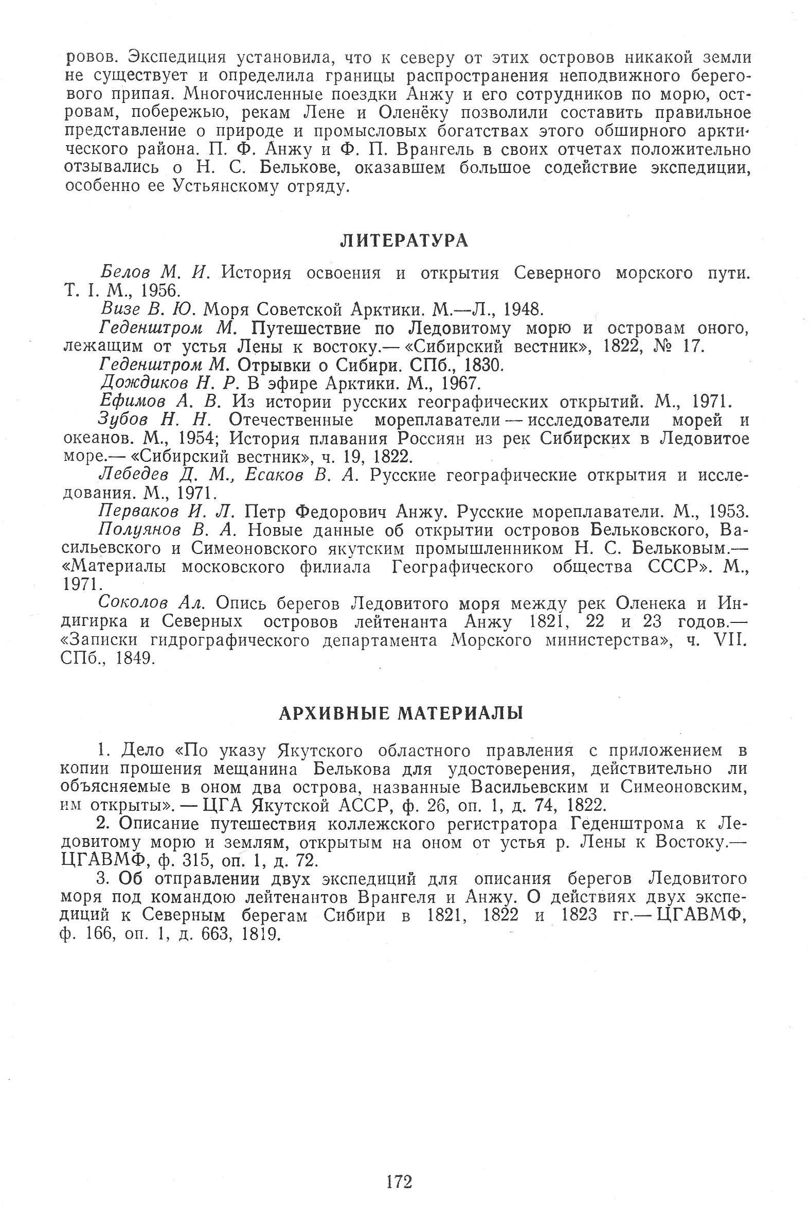 1. Дело «По указу Якутского областного правления с приложением в копии прошения мещанина Белькова для удостоверения, действительно ли объясняемые в оном два острова, названные Васильевским и Симеоновским, им открыты». — ЦГА Якутской АССР, ф. 26, on. 1, д. 74, 1822.