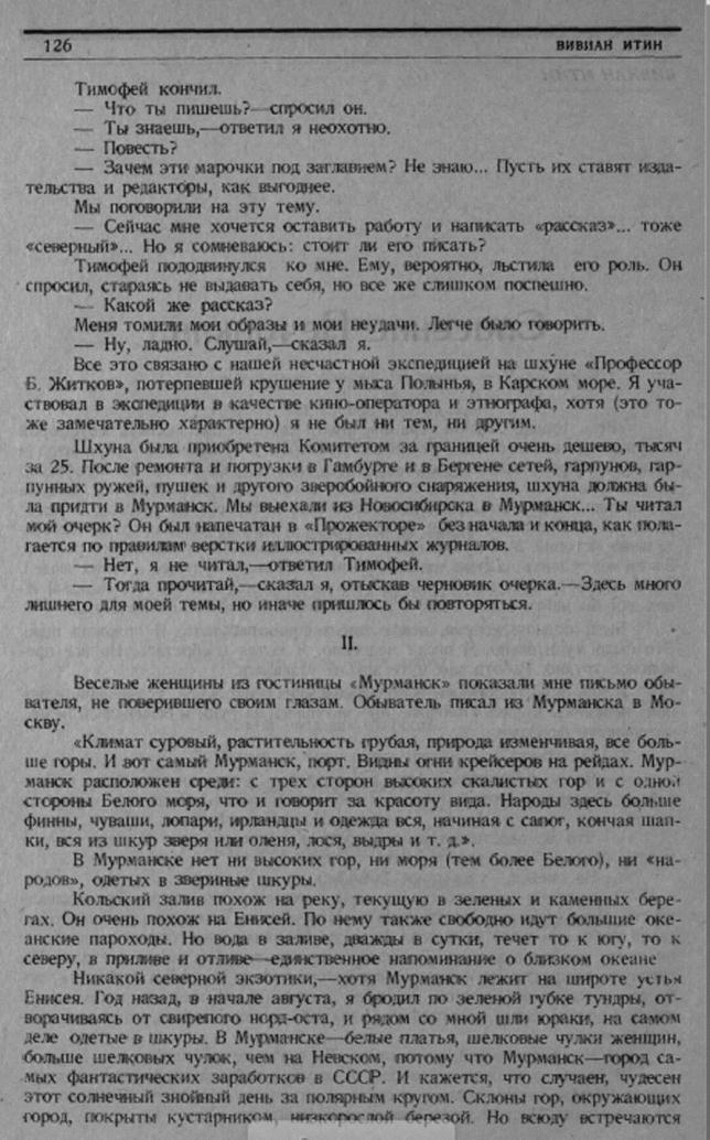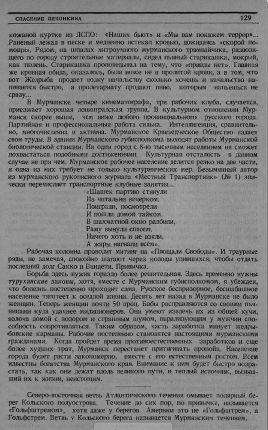 Кажется, нигде в свете нет места пьянее Мурманска. Единственная гостиница города принадлежит странному учреждению, именуемому «Жел-рыба». «Жел» — почти обязательная приставка на всех предприятиях края, т. к. хозяйственная жизнь регулируется Мурманской железной дорогой. Здоровая мысль — создать ряд подсобных предприятий для увеличения средств дороги — распухла от излишней ориентации на всевозможные пития. Подсобные предприятия заводят подсобные предприятия, забывая главную свою цель. Желрыба владеет в Мурманске несколькими магазинами и торгует всем, чем угодно, кроме рыбы. Говорят, Желрыба обращалась в губисполком с просьбой разрешить построить в порту публичный дом на том основании, что «иностранцы без этого не могут» и подсобные учреждения существуют во всех портах мира... а главное — выгодно. Нижний этаж желрыбовской гостиницы, где маленький клопиный номер стоит 5-6 р. в сутки, занят «рестораном». Днем это — приличная столовая, ночью — кабак. Эпопея поножовщины годами разыгрывается у входа. Интернациональная ругань потрясает желрыбовские стекла. Специальный вышибала, потея, спокойно выносит живые трупы и, с помощью милиционера, сваливает в мокрый ров. Там, бесчувственные, они лежат в нечеловеческих позах, иногда вниз головой, маяча в полярных сумерках, и жестокая морянка — северный ледовитый ветер — замораживает нечистоты на их непропитых еще рубахах.