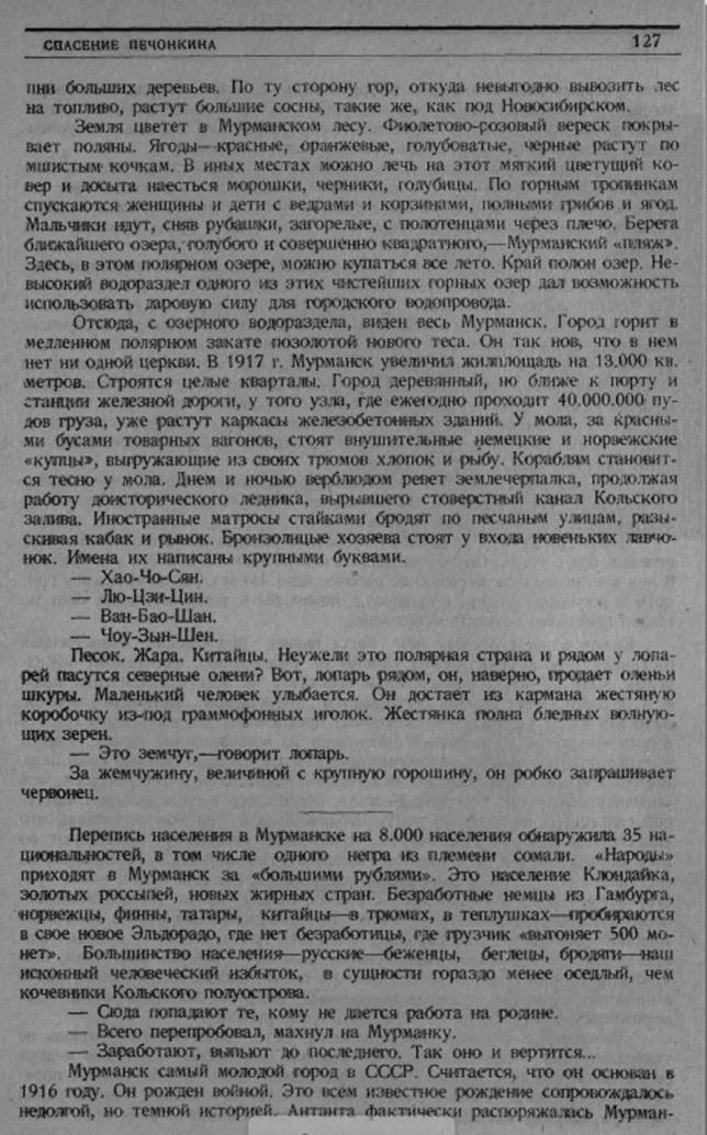 Перепись населения в Мурманске на 8. 000 населения обнаружила 35 национальностей, в том числе одною негра из племени сомали. «Народы» приходят в Мурманск за «большими рублями». Это население Клондайка, золотых россыпей, новых жирных стран. Безработные немцы из Гамбурга, норвежцы, финны, татары, китайцы — в трюмах, в теплушках — пробираются в свое новое Эльдорадо, где нет безработицы, где грузчик «выгоняет 500 монет». Большинство населения — русские — беженцы, беглецы, бродяги — наш исконный человеческий избыток, в сущности гораздо менее оседлый, чем кочевники Кольского полуострова.