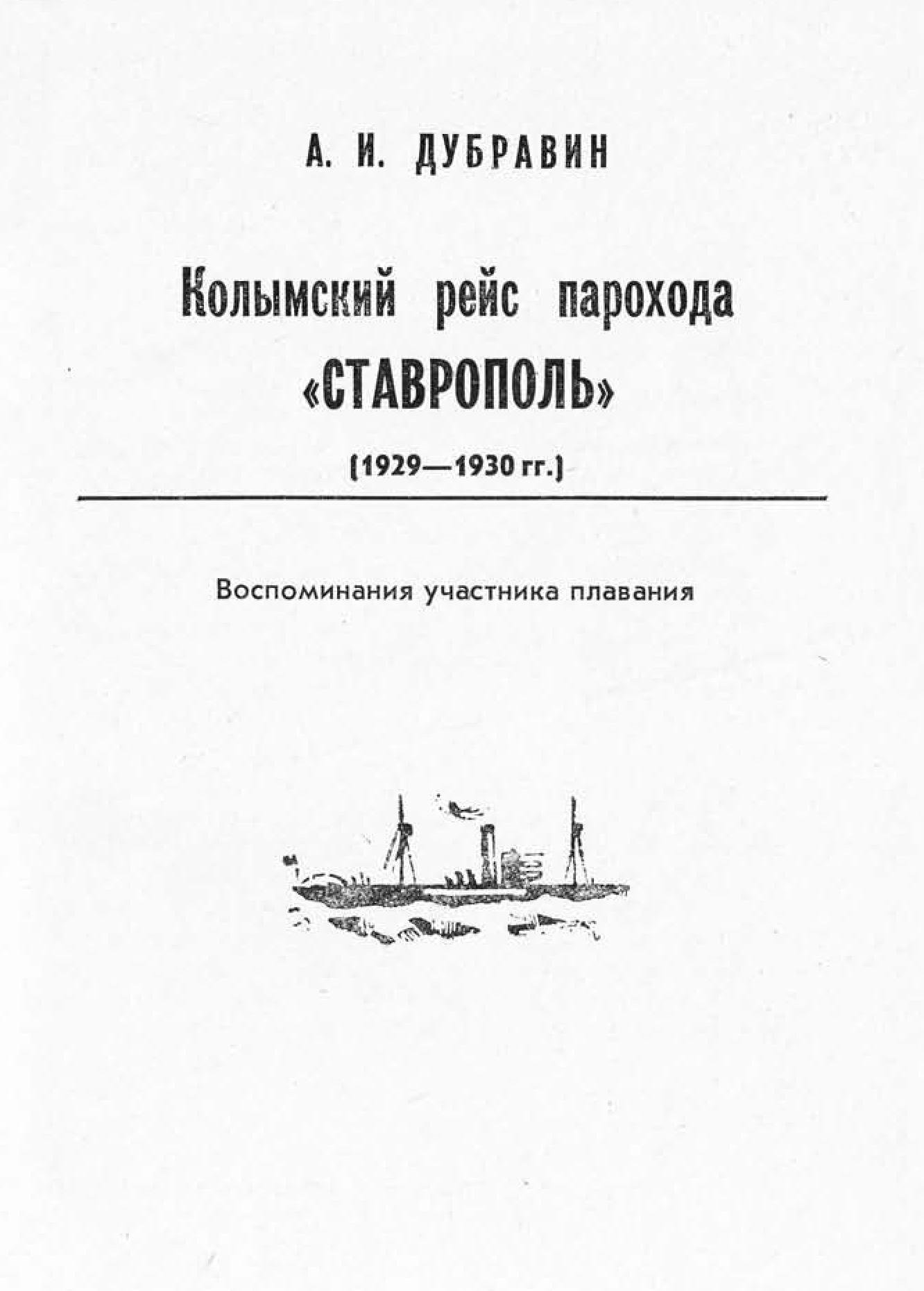 Автор предлагаемых читателю воспоминаний Андрей Иванович Дубравин по специальности инженер-кораблестроитель, почетный полярник, участник многих арктических морских экспедиций. Он на протяжении более четверти века плодотворно трудился в области арктического судостроения и эксплуатации судов специального назначения. Его перу принадлежит ряд книг и статей по различным вопросам, связанным с конструированием и приспособлением судов для плавания в Арктике. А. И. Дубравин был участником экспедиции «Ставрополя» в 1929—1930 годах из Владивостока на Колыму и его зимовки у мыса Северного (ныне мыс Шмидта).