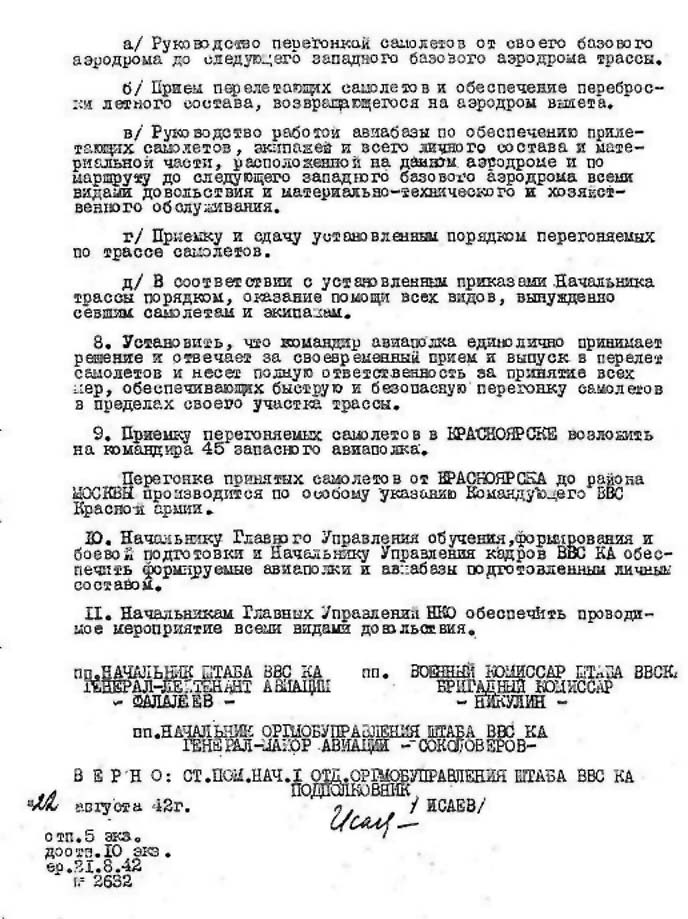 За три первых месяца (октябрь - декабрь 1942 г.) по трассе (КВТ) перегнали 114 американских самолетов, в январе 1943 г. - 128, за первую половину 1943 г. - 654, а за весь 1943 г. - 2456 самолетов (сдали 1930). К июлю трасса была освоена, а дивизия полностью подготовлена к нормальной перегонке.