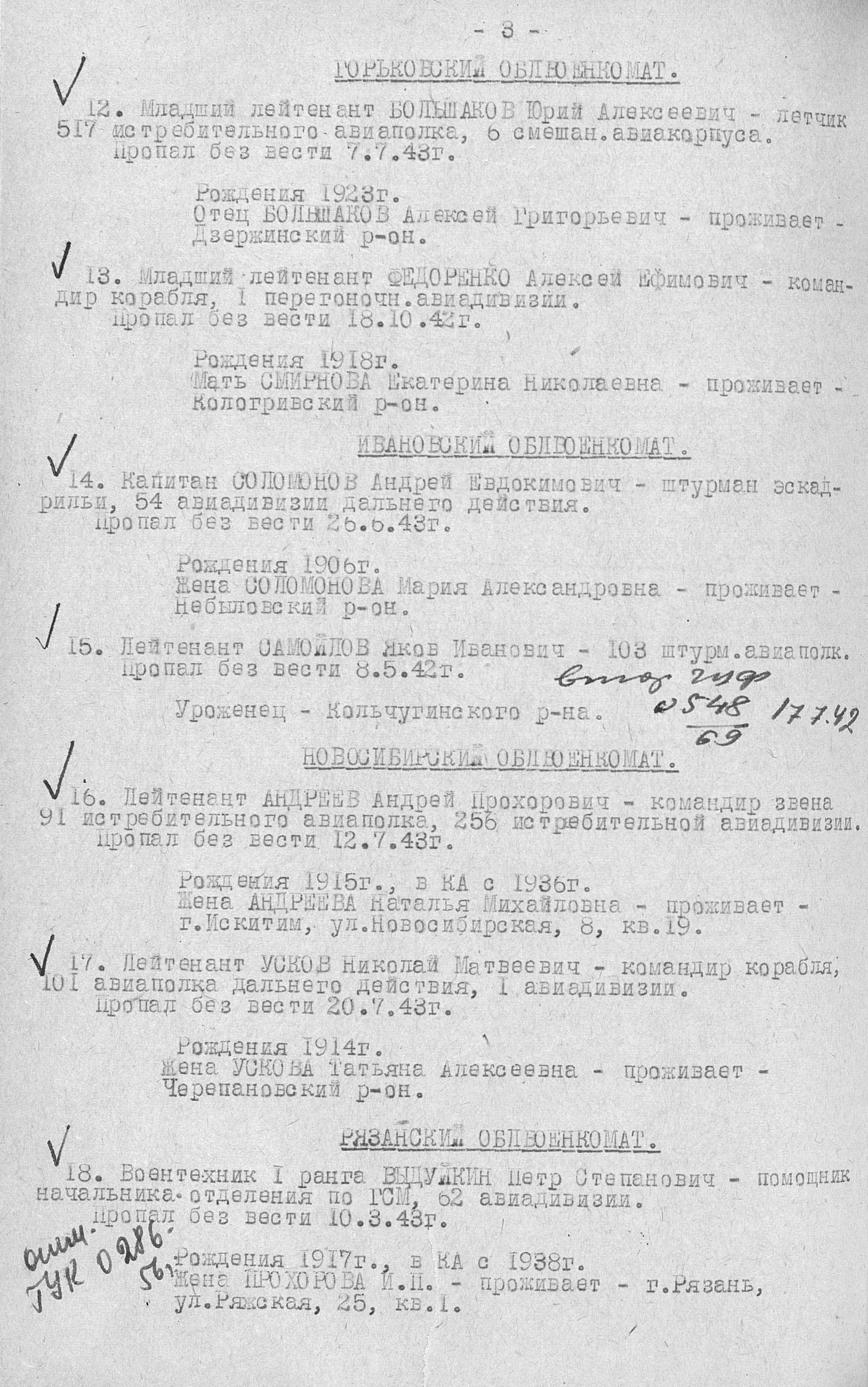 17.11.42 г.Катастрофа в Красноярске ЛИ-2 (№3965),КК-капитан Д.А.Барков.Рейс на Киренск (переброска личного состава 5-го ПАП).Сразу после взлета из-за перегруза и обледенения плоскостей и фюзеляжа самолет сорвался в штопор и упал на землю.Погибли 4 члена экипажа и 16 человек летно-технического состава 5-го ПАП.Погибшие похоронены на Троицком кладбище.