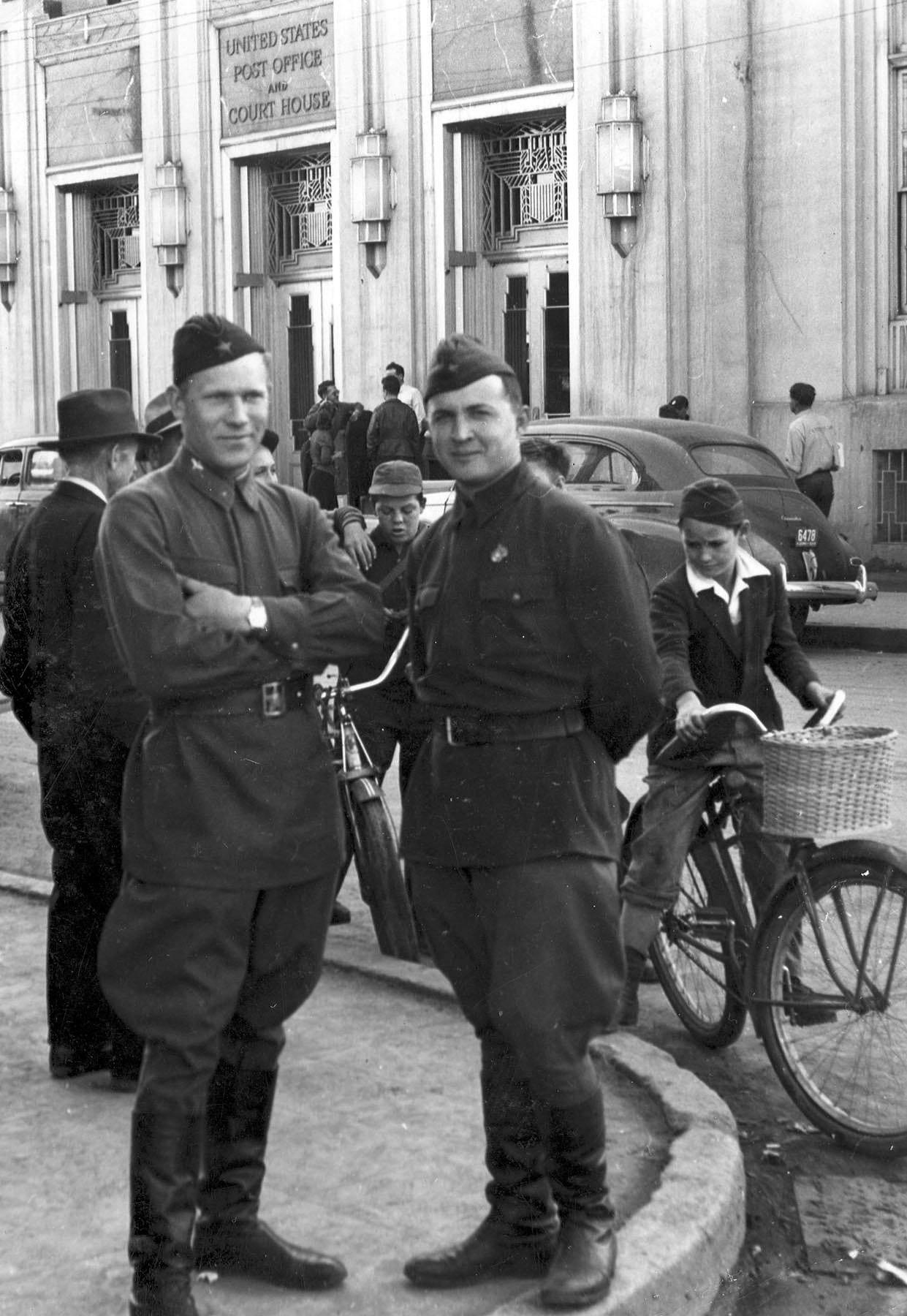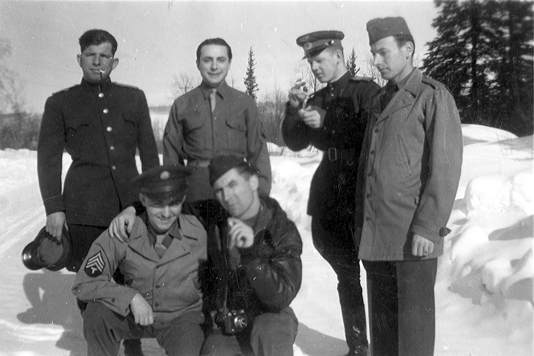 :": Советские летчики, перегоняющие самолеты по ленд-лизу, в увольнении на Аляске, местечко Фэрбенкс (Fairbanks), США.