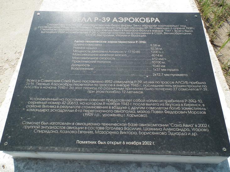 Цитата: "В октябре 1992 года, в честь 50-летия начала полетов по трассе в Якутском аэропорту был открыт мемориал памяти погибших перегонщиков. В центре его высится увенчанная стилизованной птицей в полете стела. От нее идет аллея к площадке, по периметру которой установлено восемь плит с именами 113 летчиков, погибших на трассе. Здесь же покоится прах экипажа бомбардировщика Б-25, потерпевшего катастрофу в районе поселка Жатай 7 мая 1943 года. Завершением мемориала стал установленный здесь полномасштабный макет истребителя Р-39 «Аэрокобра»."