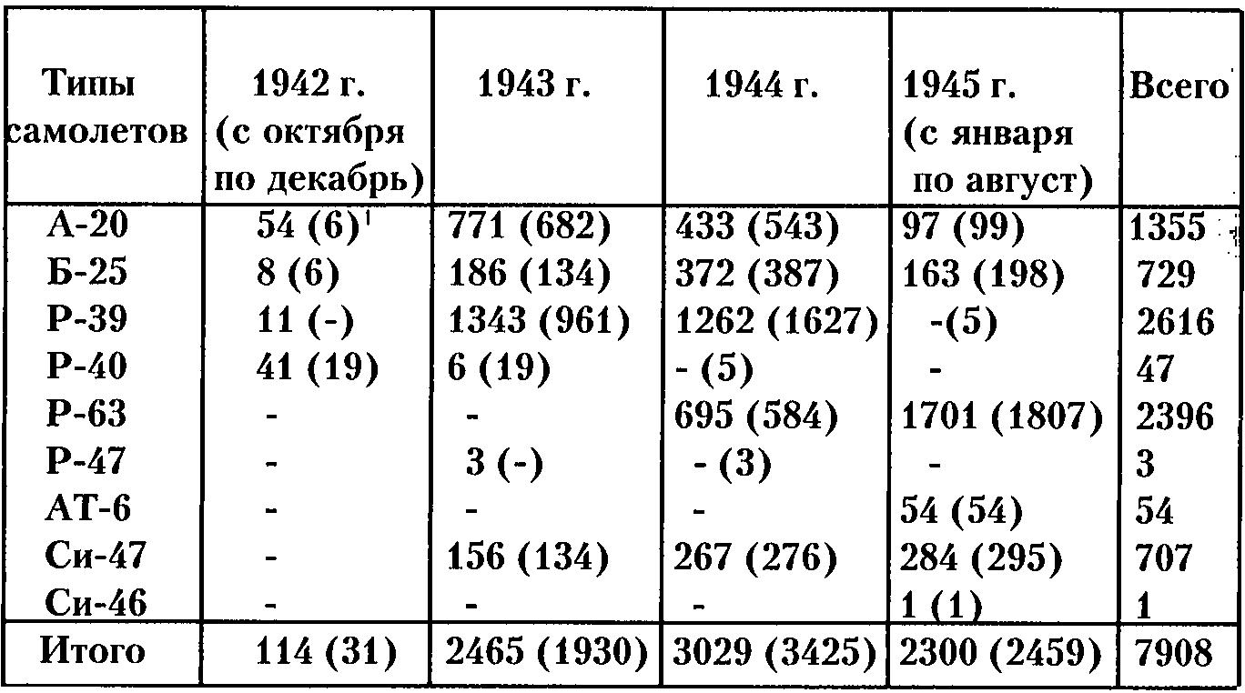 Из общего количества перегнанных самолетов сдано на пунктах: Москва - 191 самолет, Красноярск - 7079 самолетов, Владивосток - 71 самолет, Чита - 10 самолетов, Новосибирск - 10 самолетов, Иркутск - 2 самолета, Хабаровск - 109 самолетов, Петропавловск на Камчатке - 179 самолетов, Укурей - 266 самолетов, Спасск - 6 самолетов, Ворошиловск - 2 самолета, Нерченск - 2 самолета, 111-й разъезд - 99 самолетов, Якутск ГВФ - 58 самолетов, Магадан ВВС ТОФ - 10 самолетов.