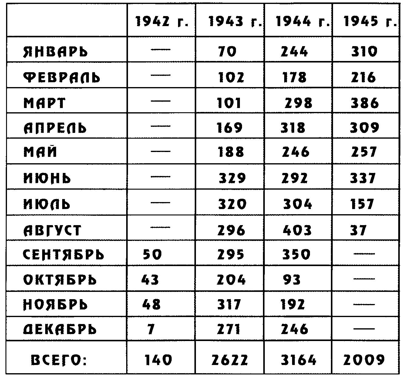 14. За 1944 г. дивизией перегнано из Фербенкса (США) на нашу территорию (на аэродромы Уэлькаль, Марково и Анадырь - на Чукотке) 3029 самолетов, из них: