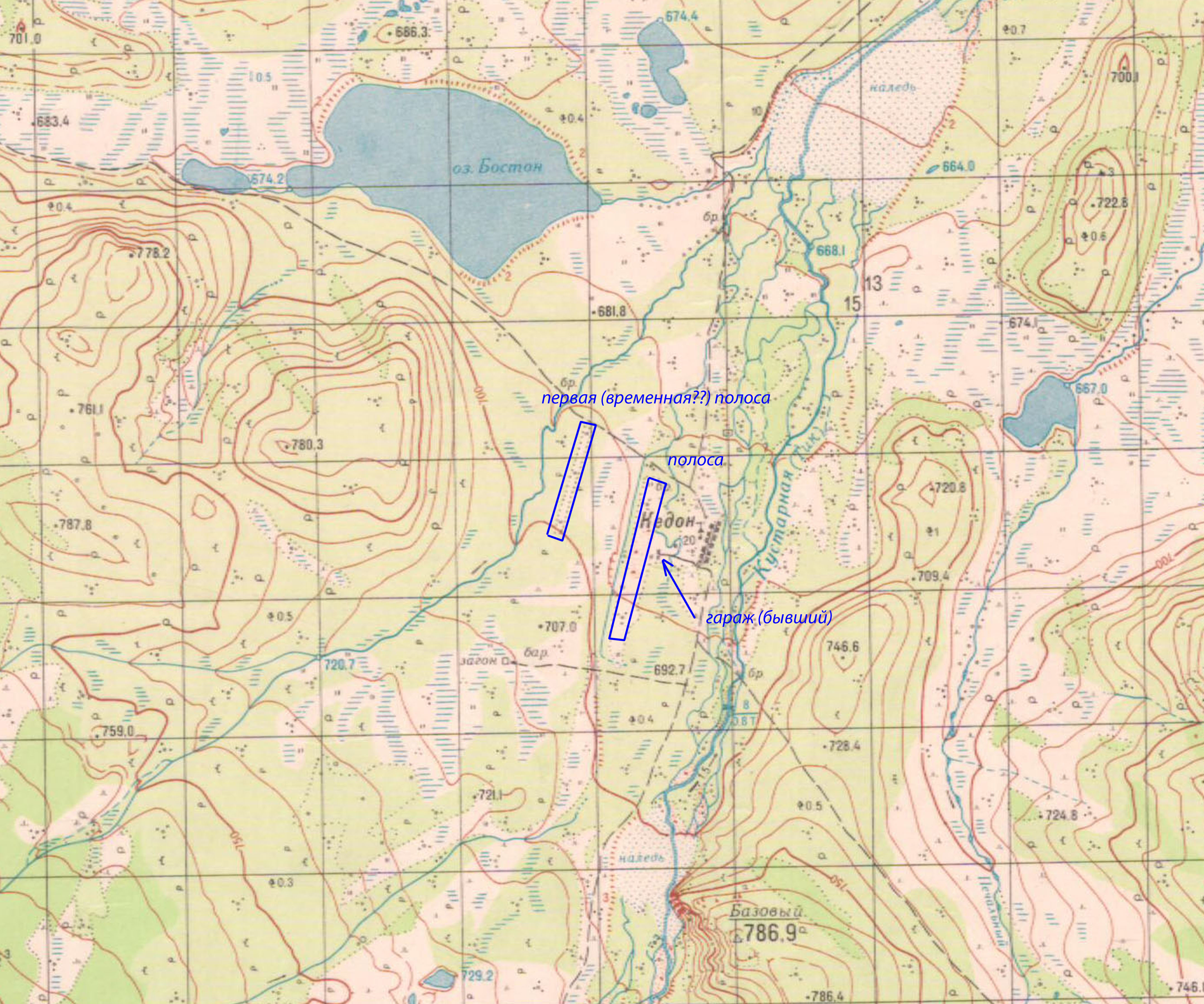 Съёмка 1969 года. Первая полоса видна узкой километровой полосой кустов в километре западнее посёлка. Но что-то там было не айс, и потом полосу переместили непосредственно к домам, выкопав длиннющую водоотводную канаву (она отлично видна на карте, но на местности уже заплыла полностью). Там на карте какие-то бараки, но их не стало уже очень давно, в 70-х. Осталась только смотровая яма на месте гаража.