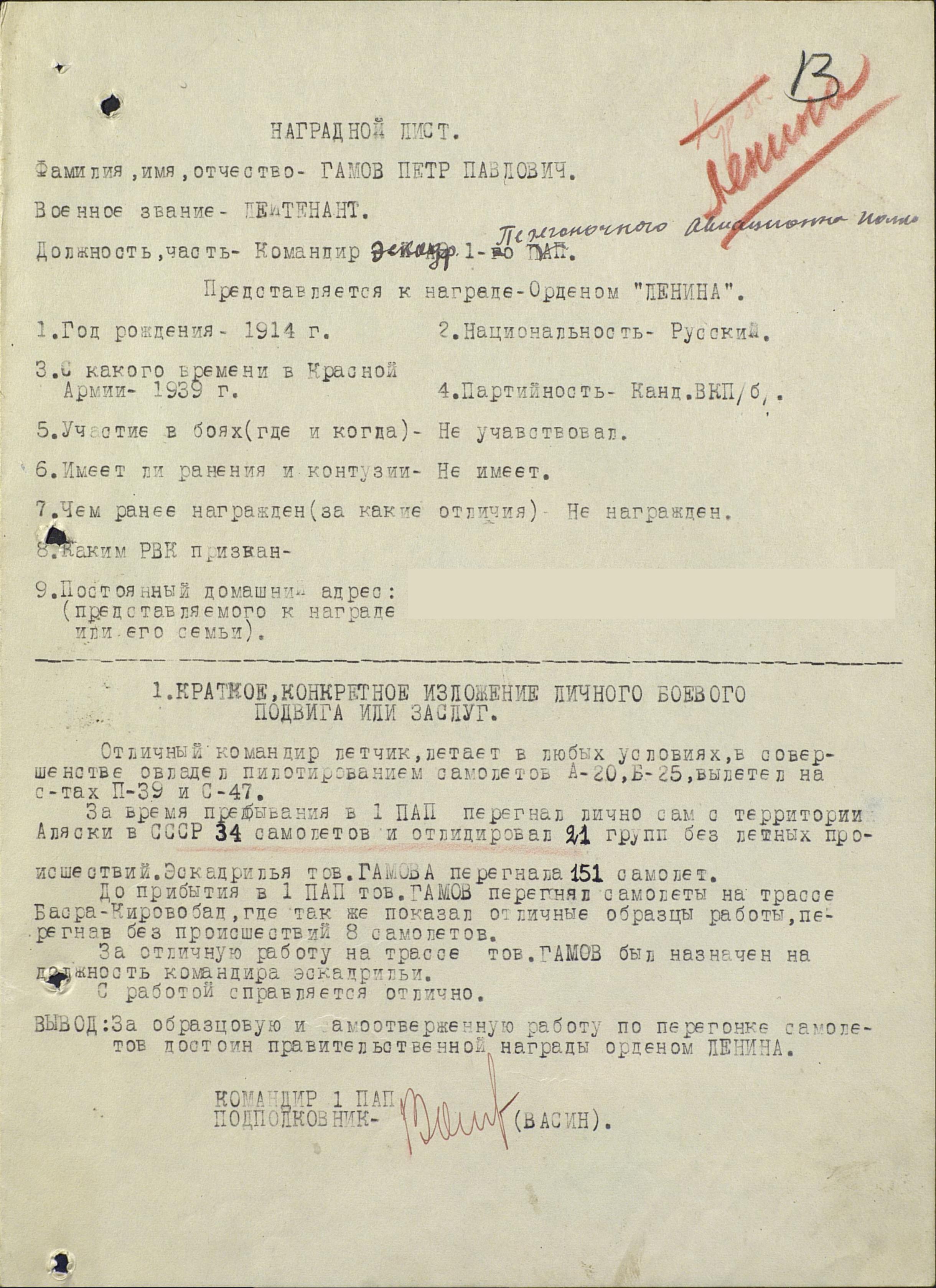 Интересно сравнить наградной лист П.П. Гамова на орден Красного знамени и более ранний наградной лист на орден Ленина. Фактически, показатель работы за данный отчетный период.