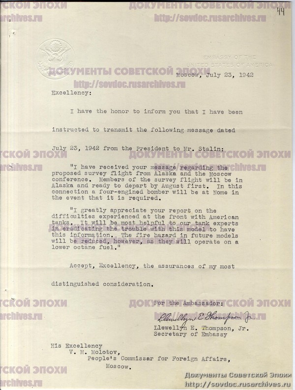 Послание Рузвельта Сталину о разведывательном полете американского самолета, о качестве американских танков.