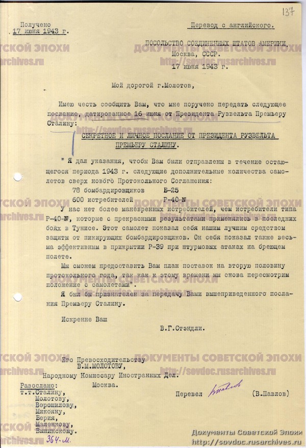Письмо Стэндли Молотову с текстом послания Рузвельта Сталину о дополнительных поставках самолетов Советскому Союзу.
