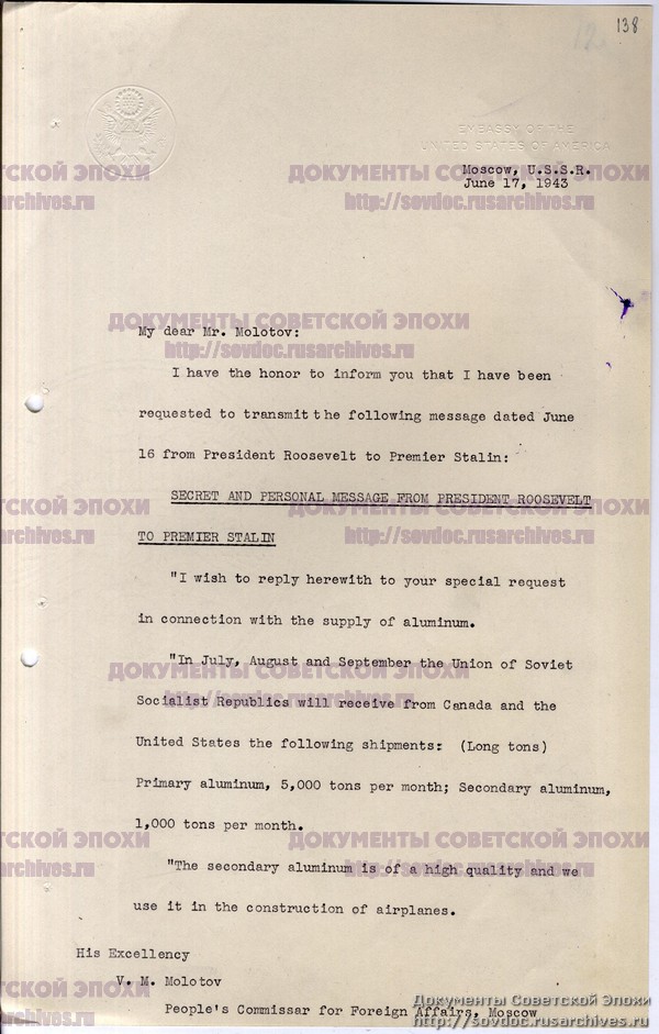 Послание Рузвельта Сталину о переброске самолетов через Дальний Восток, о разведывательном полете американского самолета из Аляски, о встрече военных представителей.