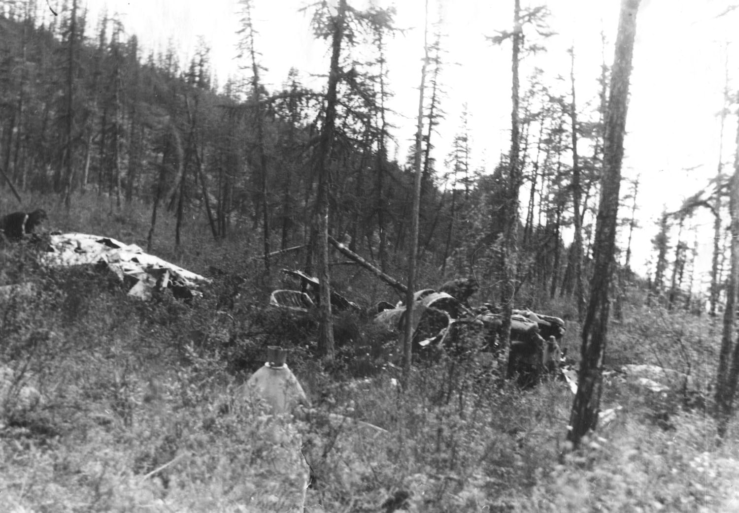 Вскоре увидели, что от посёлка в направлении сопки движется гусеничный трактор, с которым мы встретились на полпути к сопке. На прицепе у трактора были сани из круглых брёвен, косо срезанных спереди. Всю поклажу сбросили на сани, а сами продолжили путь пешком, но по колее, проложенной трактором. Это было уже значительно легче. Склон сопки был уже твёрд, со слабой травой. Члены экспедиции пересекали сопку с запада на восток шеренгой врассыпную. Почва на сопке была песчаная с выступающими небольшими камнями. Вдали на восточном склоне сопки увидели уже чёрное пятно сгоревшего самолёта. Появились следы и мелкие бороздки от касания самолёта об почву, и тут я увидел 25-долларовую ассигнацию, свежую по виду, несмотря на проливные дожди накануне. Две-три такие же ассигнации подняли и американцы. У меня даже сердце ёкнуло – неужели кто-то жив, и в отчаянии выбросил деньги. Но через несколько шагов увидели оторванную левую руку, одетую в рукав кожаной куртки. Куртка и другая одежда были разорваны по карману, откуда и рассыпались деньги. Это было то немногое, что осталось от обгоревшего самолёта. Тела пилота и штурмана, находившегося в кабине радиста, остались в кабинах самолёта. Лётчик, возможно, был в сознании и пытался посадить самолёт с убранными шасси, но в конце врезался винтами в землю, а бензин из раздавленного подвесного бака загорелся. Штурман пытался выпрыгнуть через открытый люк внизу фюзеляжа, о чём свидетельствует оставшаяся с наружи рука. Но ему уже не хватило высоты, чтобы покинуть самолёт.