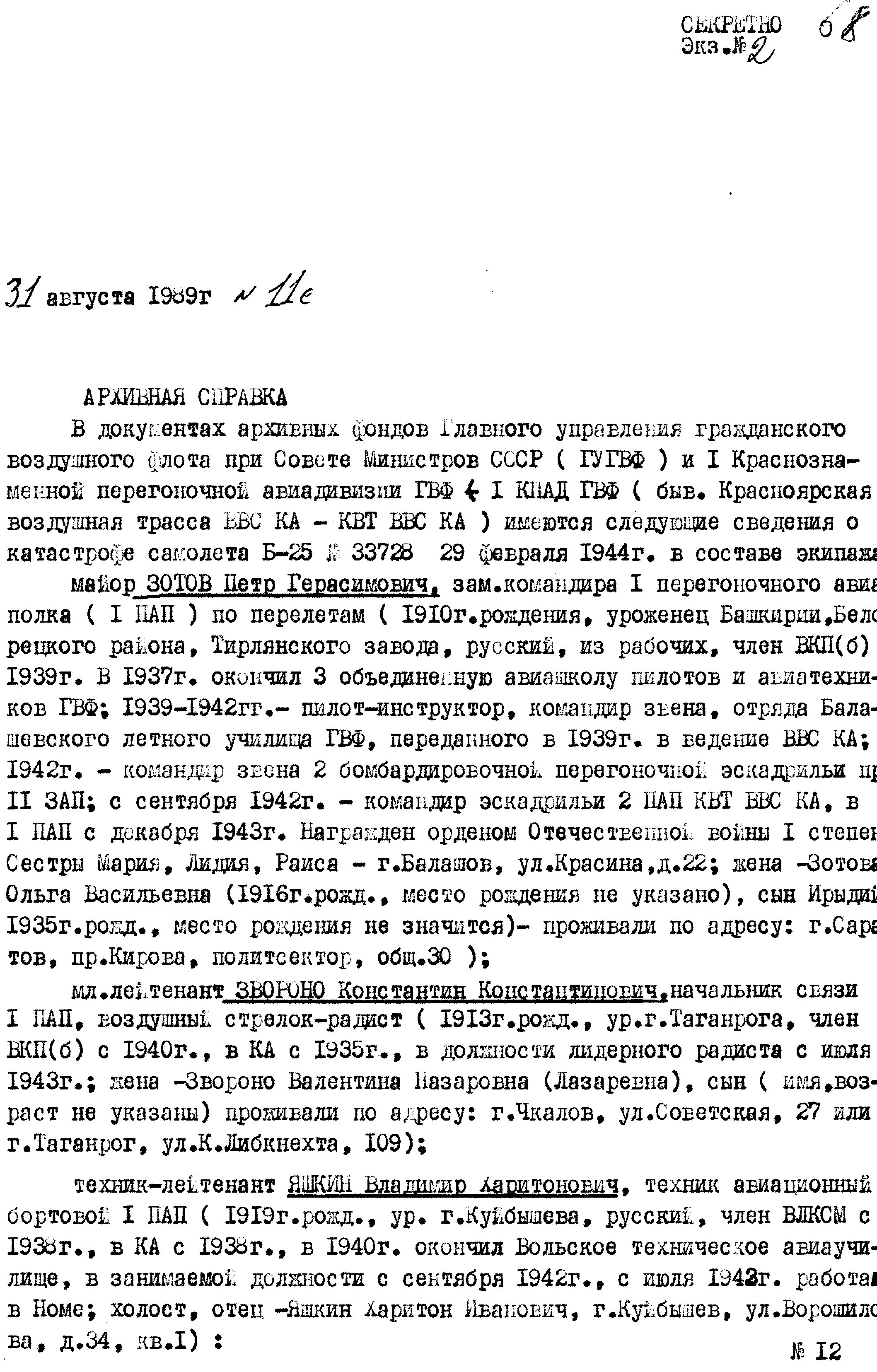 24.3.43 г. при перелете группы самолетов 7 ПАП по маршруту Сеймчан – Якутск при сложных метеорологических условиях полета отстал от группы и без вести пропал на самолете Р-39 зам. ком. АЭ 7 ПАП капитан КОВОЛЕВ.