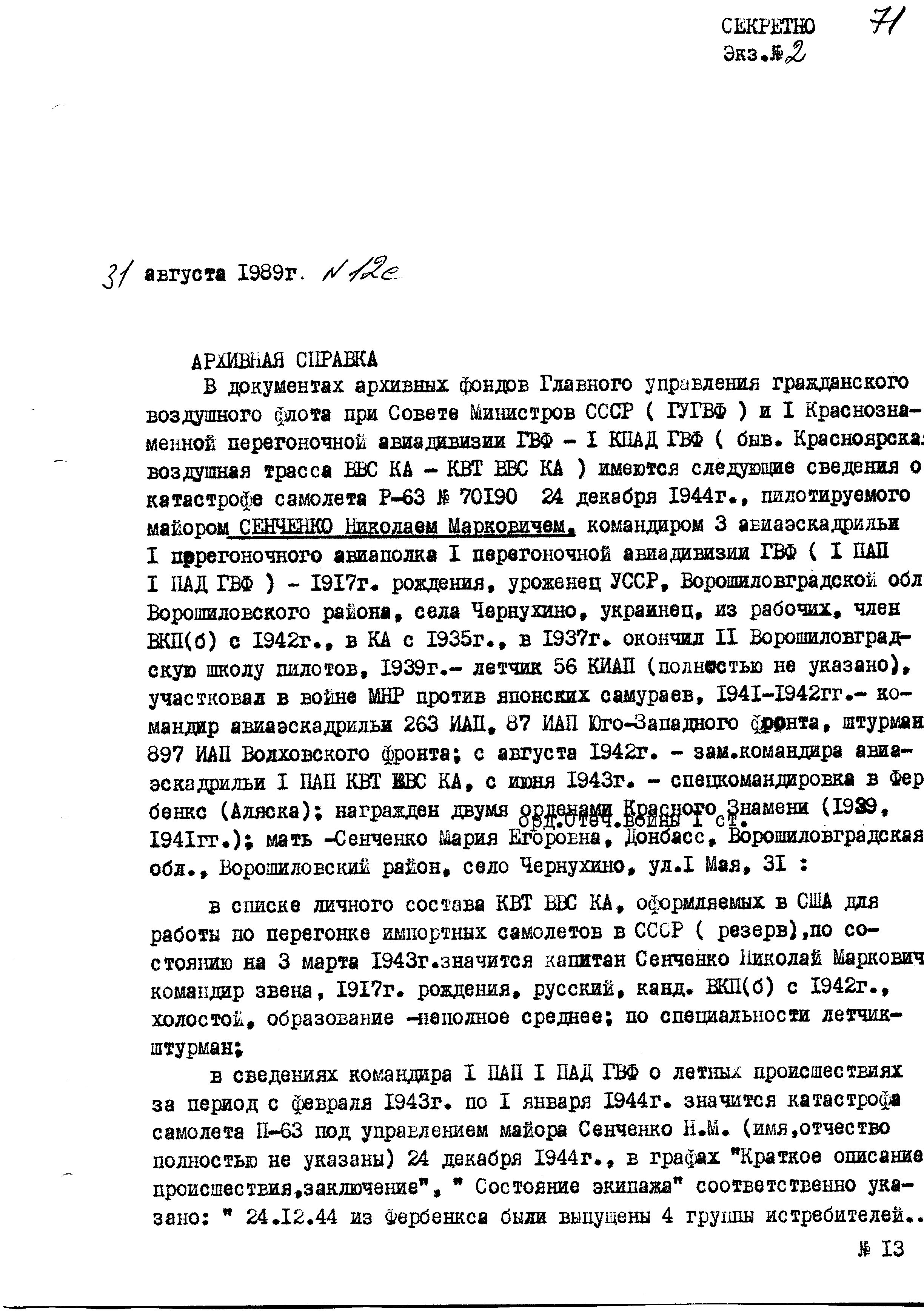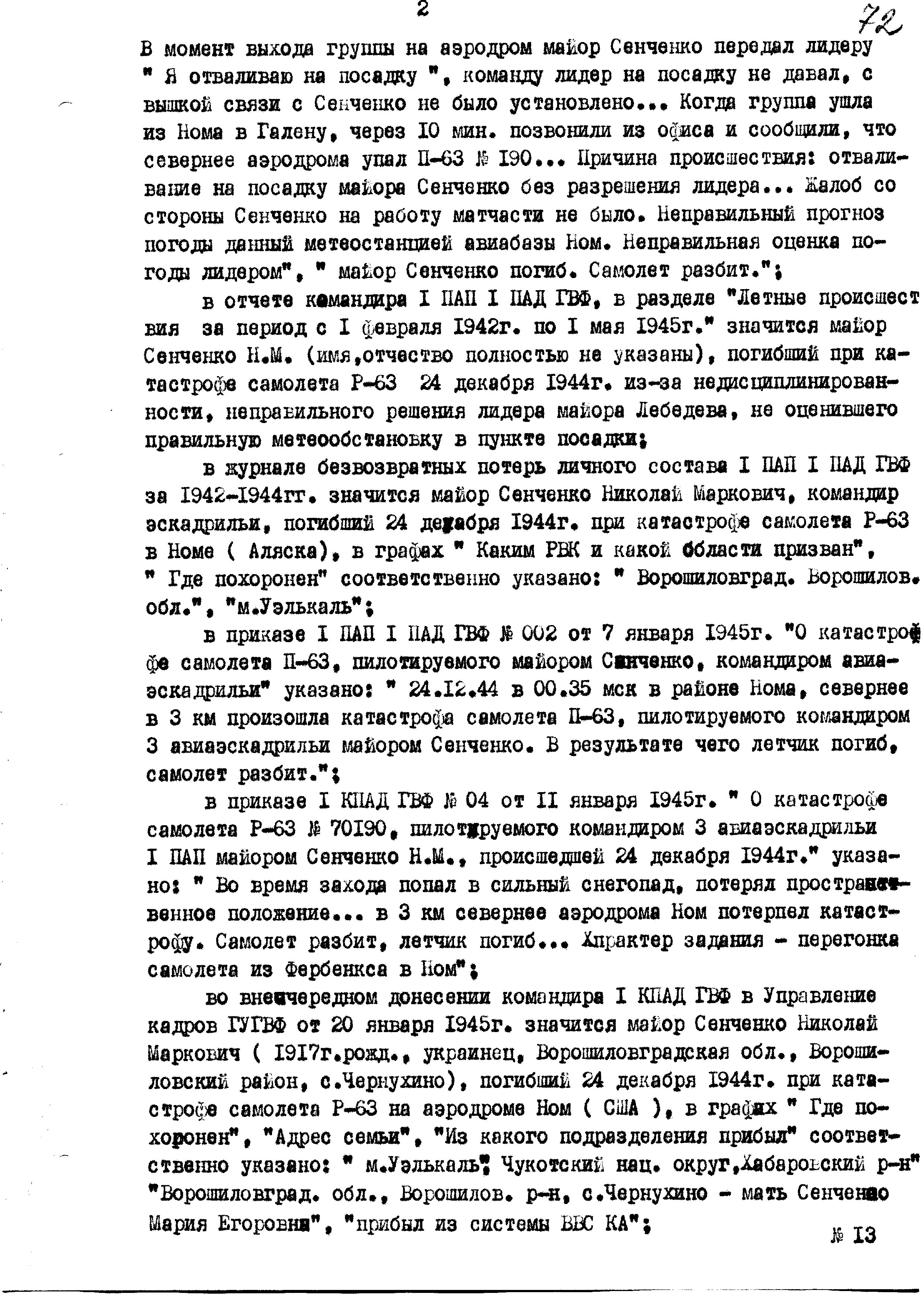 Единственная катастрофа советского летчика-истребителя на Аляске за 1944 год была 24 декабря: командир АЭ 1 ПАП майор Сенченко Николай Маркович.
