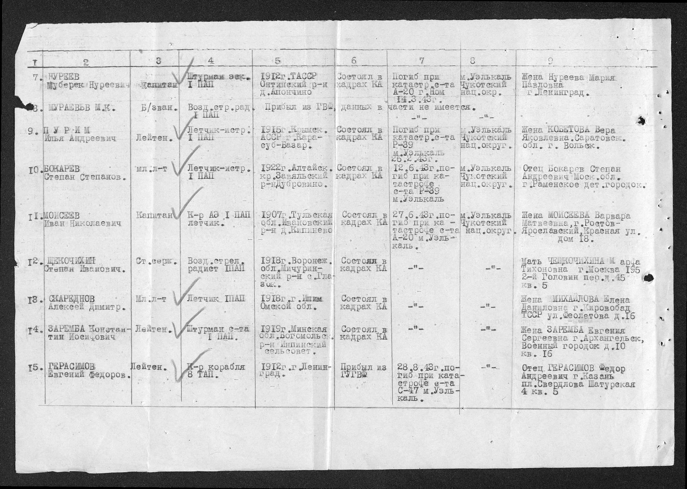 Петухов Николай Федорович. (Мл.л-т. Штурман корабля-летчик 8ТАП). Погиб 28.08.43 г. при катастрофе с-та С-47 м.Уэлькаль. Похоронен м.Уэлькаль Чукотский нац.округ.