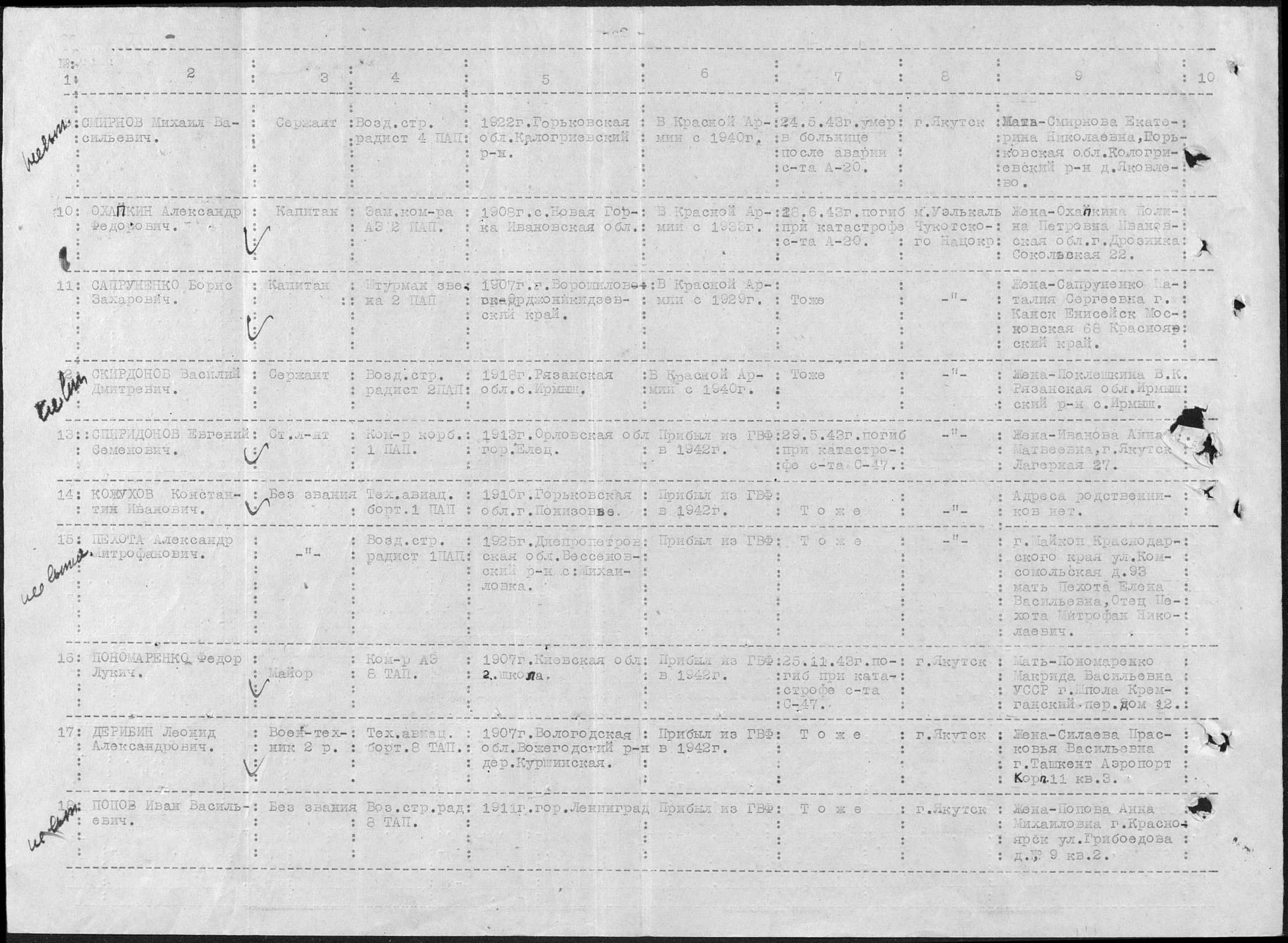 Залогин Евгений Михайлович (б/з, воздушный стрелок-радист). 1910г., г.Чумень Сибирь. Прибыл из ГВФ. Погиб при выполнении боевого задания 9.6.43 г. Похоронен в М.Сеймчан Средне-Колымского р-на. Мать Залогина Татьяна Терентьевна г.Ростов н/Дону 2-я Комсомольская 13.
