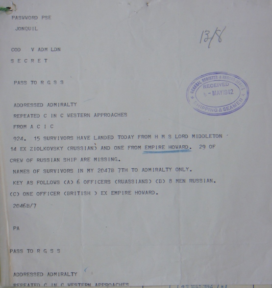 По данным сайта http://www.uboat.net повреждение п/х "Циолковский" приписывается германской ПЛ U-589 в результате атаки двумя торпедами в 03:13h 01.05.1942 г. (Услышан взрыв через 5 мин.) Время атаки не совпадает с указанным в донесении (см.ниже). Ю. Роувер поражение не указывает.