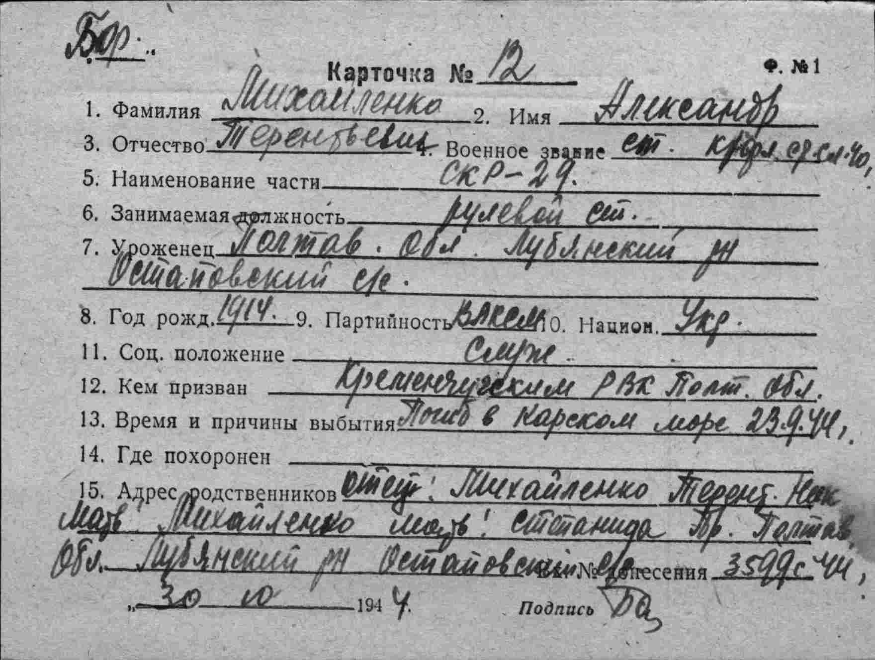 Место призыва Кременчугский РВК, Украинская ССР, Полтавская обл., Кременчугский р-н
