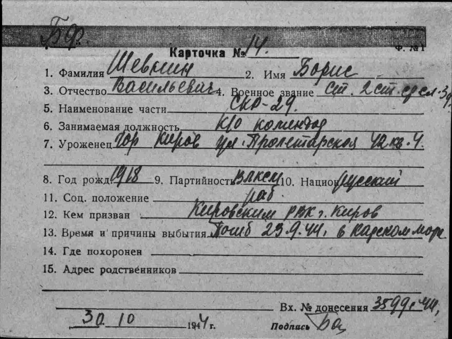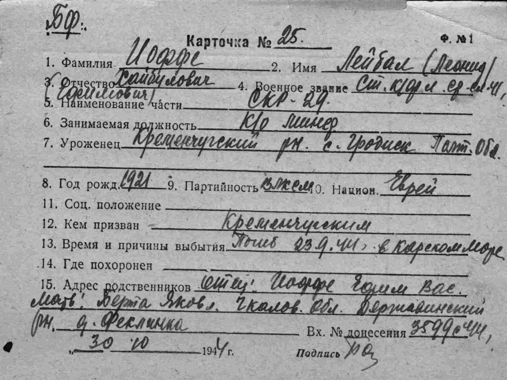 Место призыва Кременчугский РВК, Украинская ССР, Полтавская обл., Кременчугский р-н