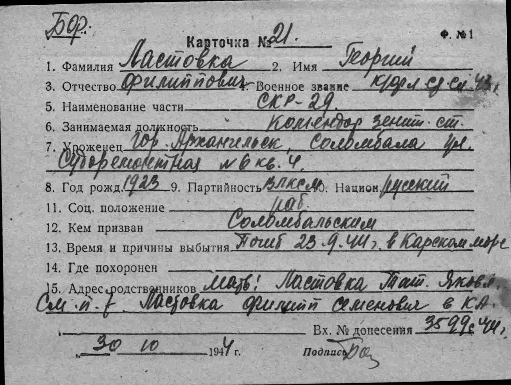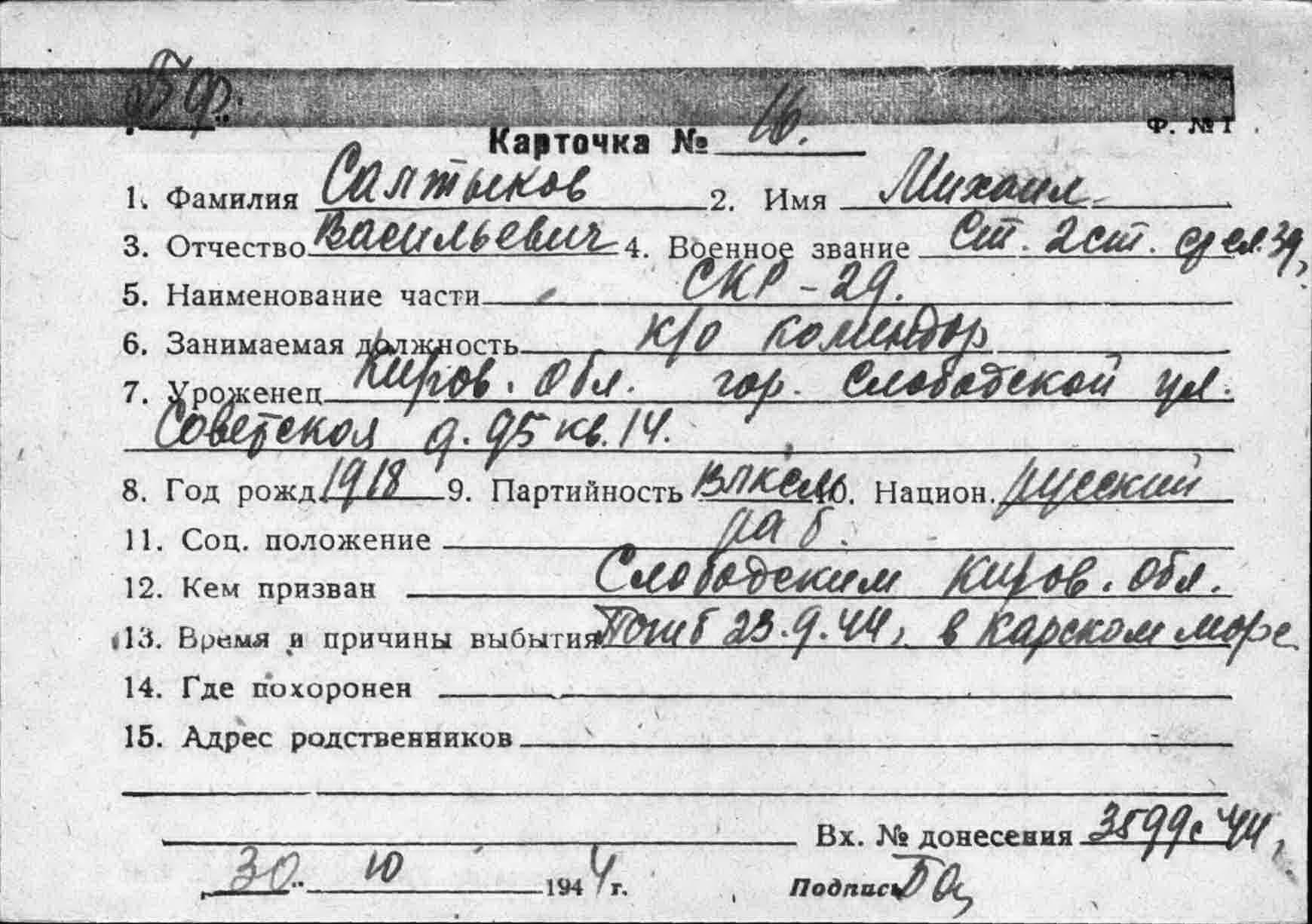 Место рождения Сталинская обл., г. Константиновка, п. Украинский, ул. Полтавская, 4