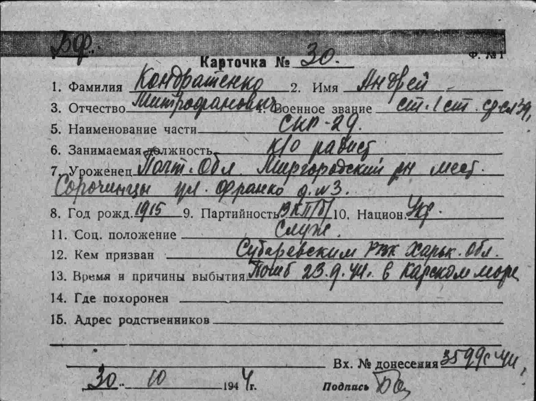 Место призыва Сударевский РВК, Харьковская обл.
