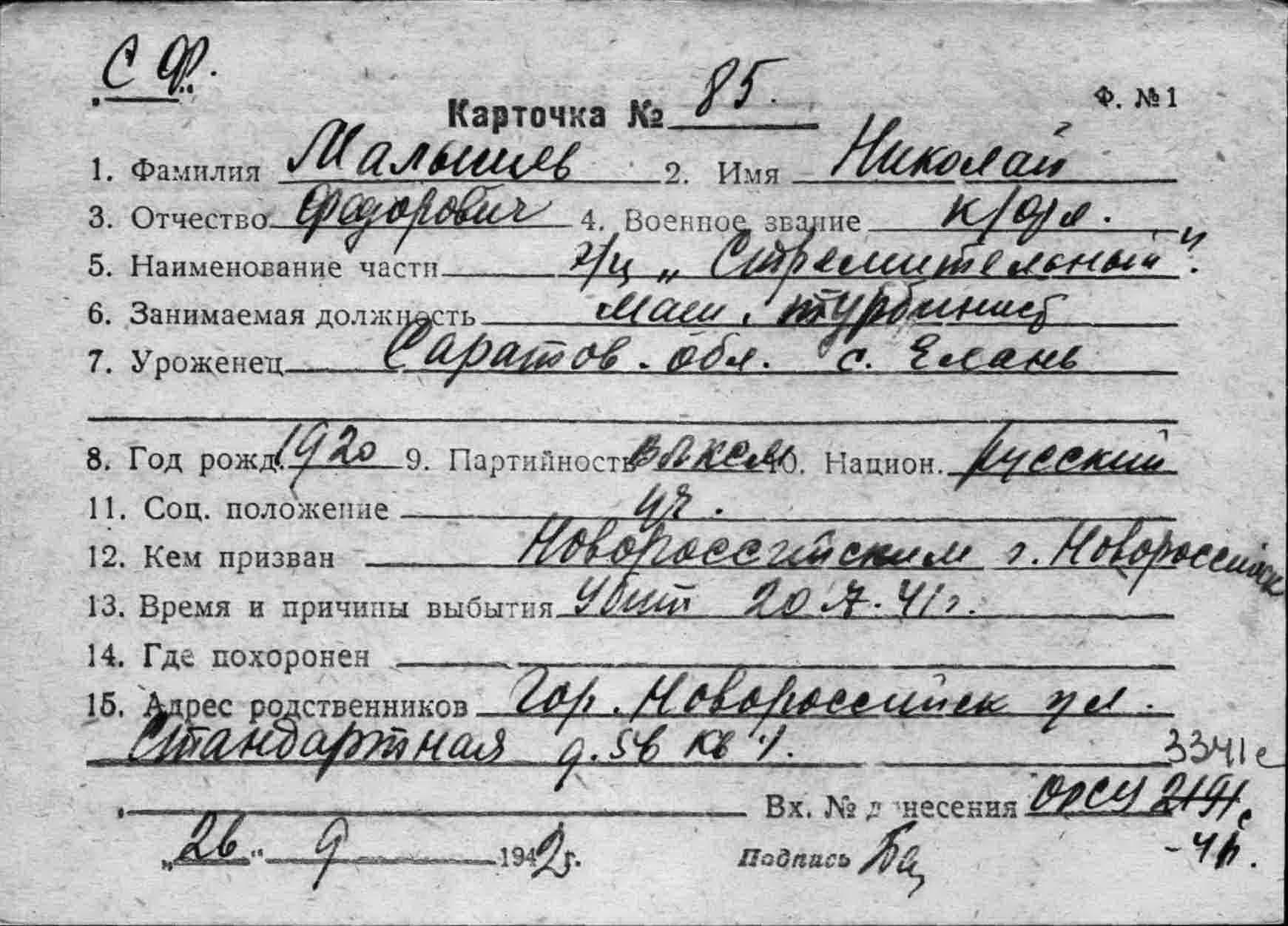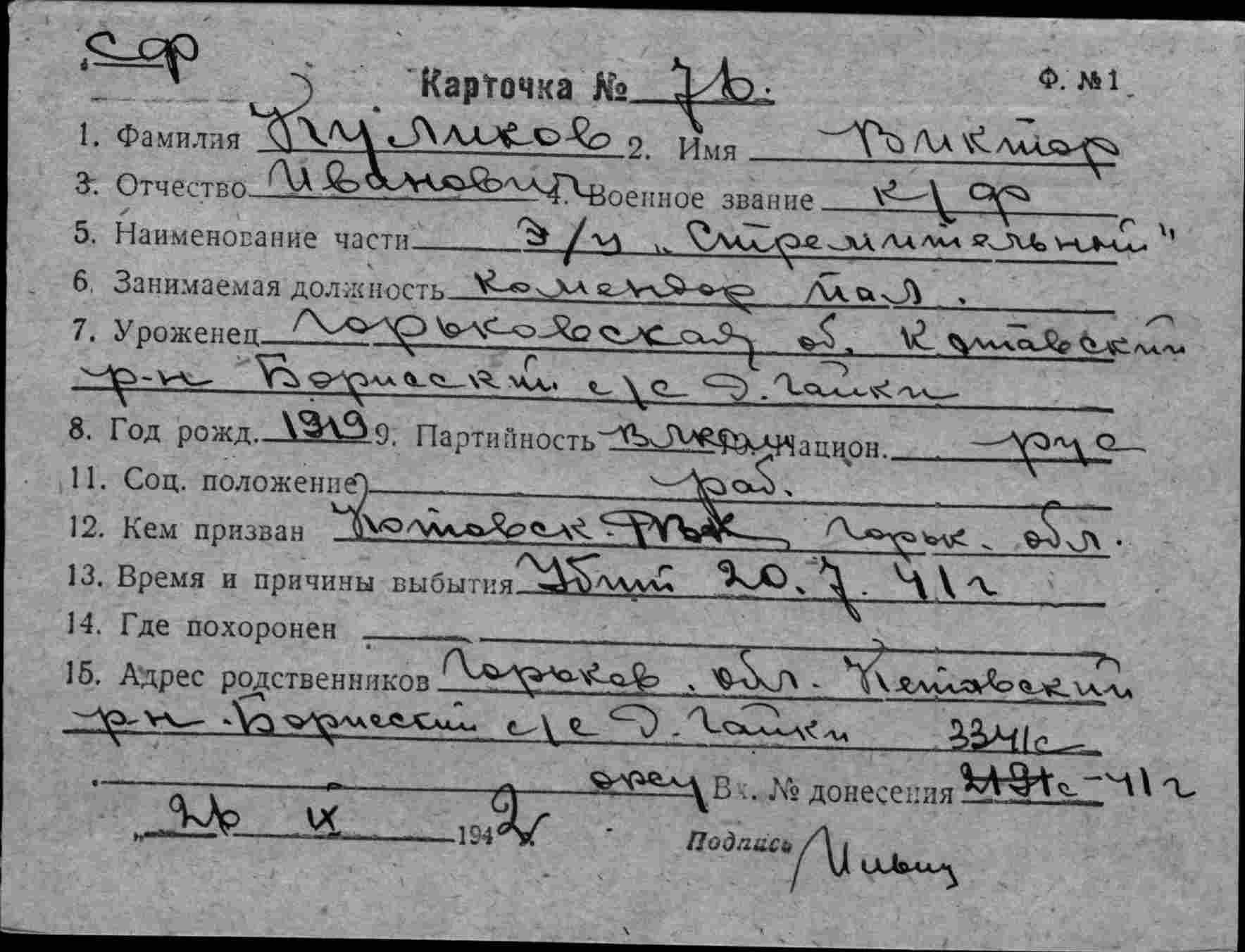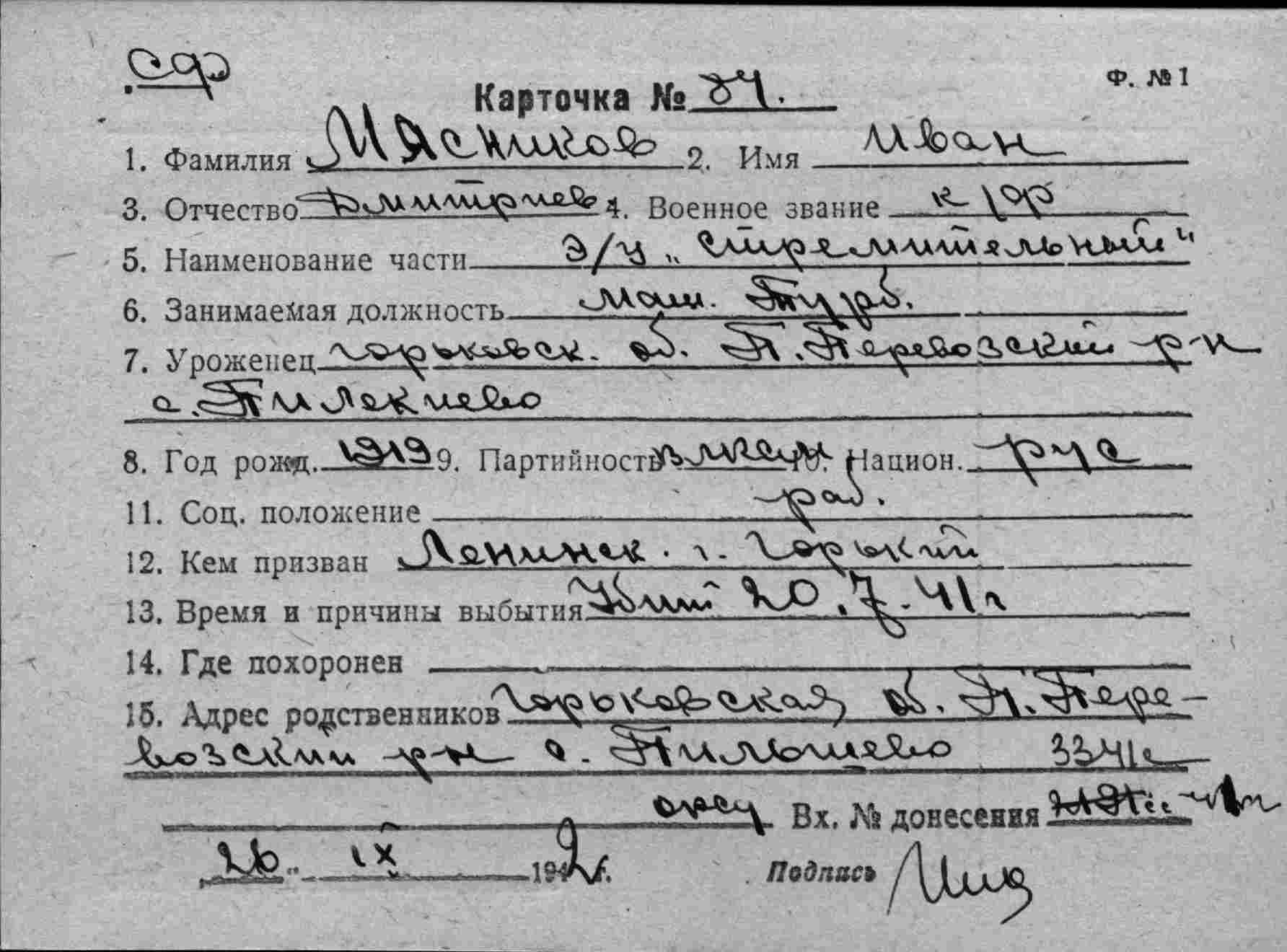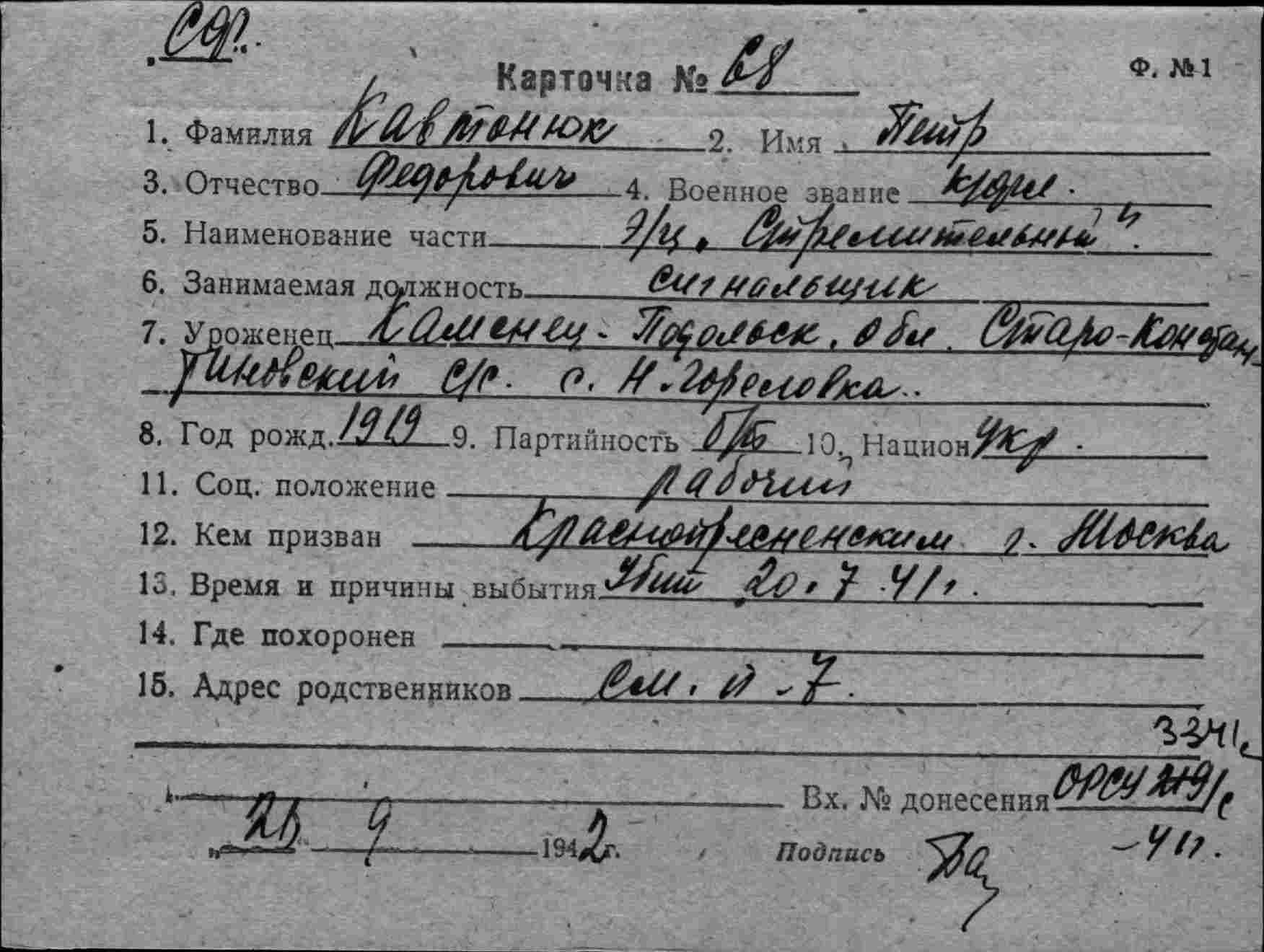 Место рождения Харьковская обл., Чутовский р-н, Орлеровский с/с, г. Свантиково