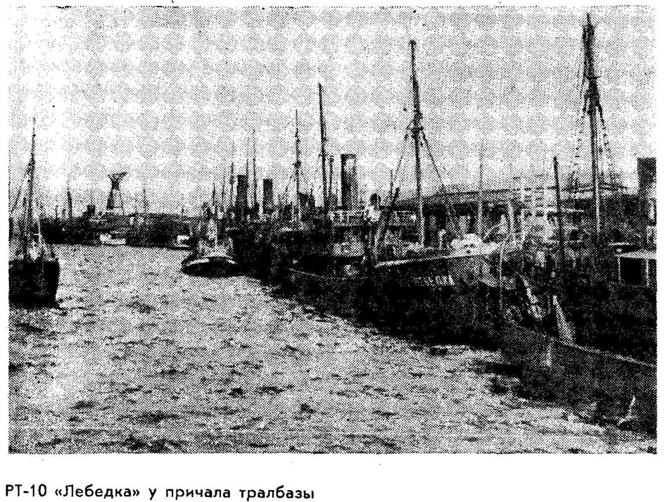 Команда РТ-10 «Лебедка» перед уходом в стахановский рейс. Первый ряд (слева направо): штурман Антуфьев, Ионин, матросы Клевцов и Монахов, капитан Скорняков, первый штурман Карпенко. Второй ряд (слева направо): засольщик Краснов, помтралмейстера Попов, кочегар Федосеев, боцман Кручина, салогрей Сорокин, второй штурман Бурмакин, матросы Машков, Леонтьев и Стапчук. Третий ряд (слева направо): второй механик Бубнов, практикант, машинист Елец, матросы Киселев и Гребнев, радист Белянкин, тралмейстер Чухчин, рыбмастер Мылов, засольщик Михайлов, матрос Голованов. Четвертый ряд (слева направо): третий механик Лернер, старший механик Корчагин, слесарь Лобанов, утилизатор Гречанюк, засольщик Лапенко, помощник тралмейстера Машко, старший клипфискник Кузнецов, клипфискник Роженков, матрос Кожин.