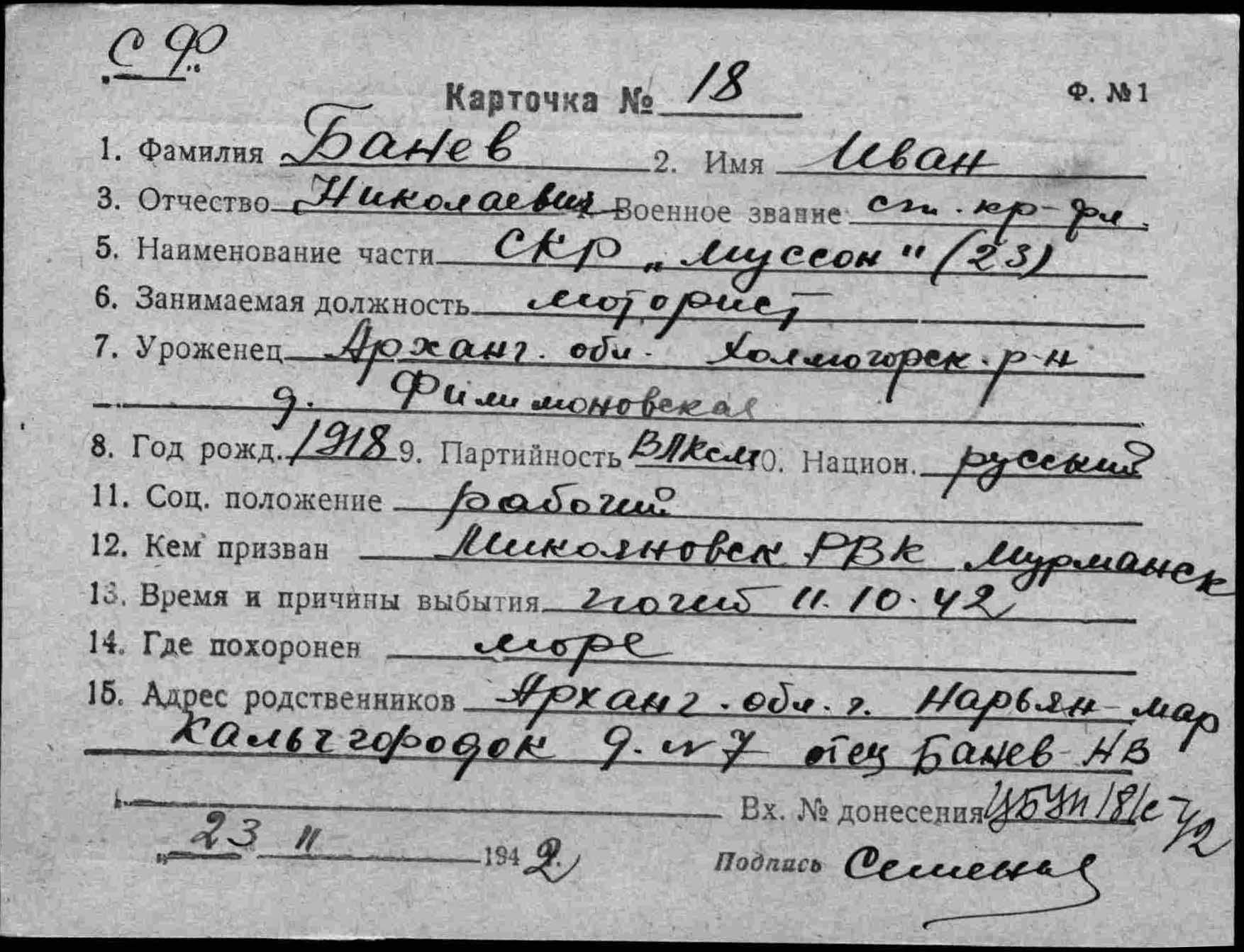 15. Гибель сторожевого корабля "Муссон"Еще одной жертвой германских мин, выставленных еще в конце августа 1942 года подводной лодкой U-589, стал советский сторожевой корабль СКР-23 "Муссон" (быв. рыболовный траулер РТ-54 "Судак").