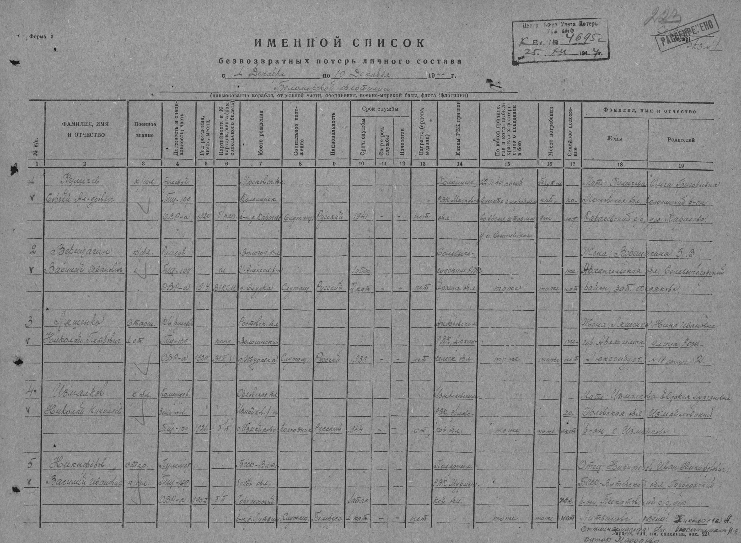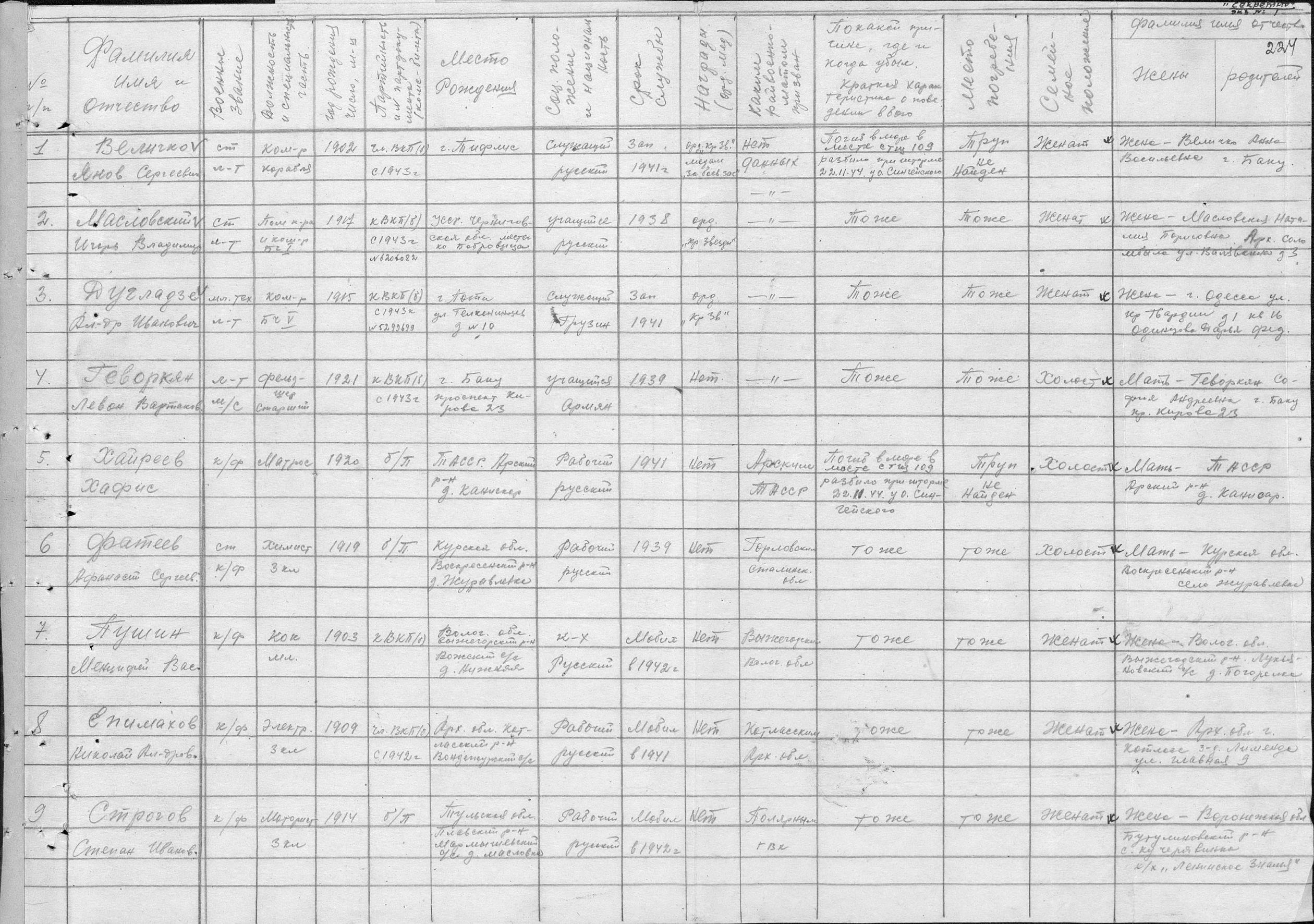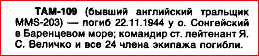 Список членов экипажа тральщика Т-109, погибших 22.11.1944 года