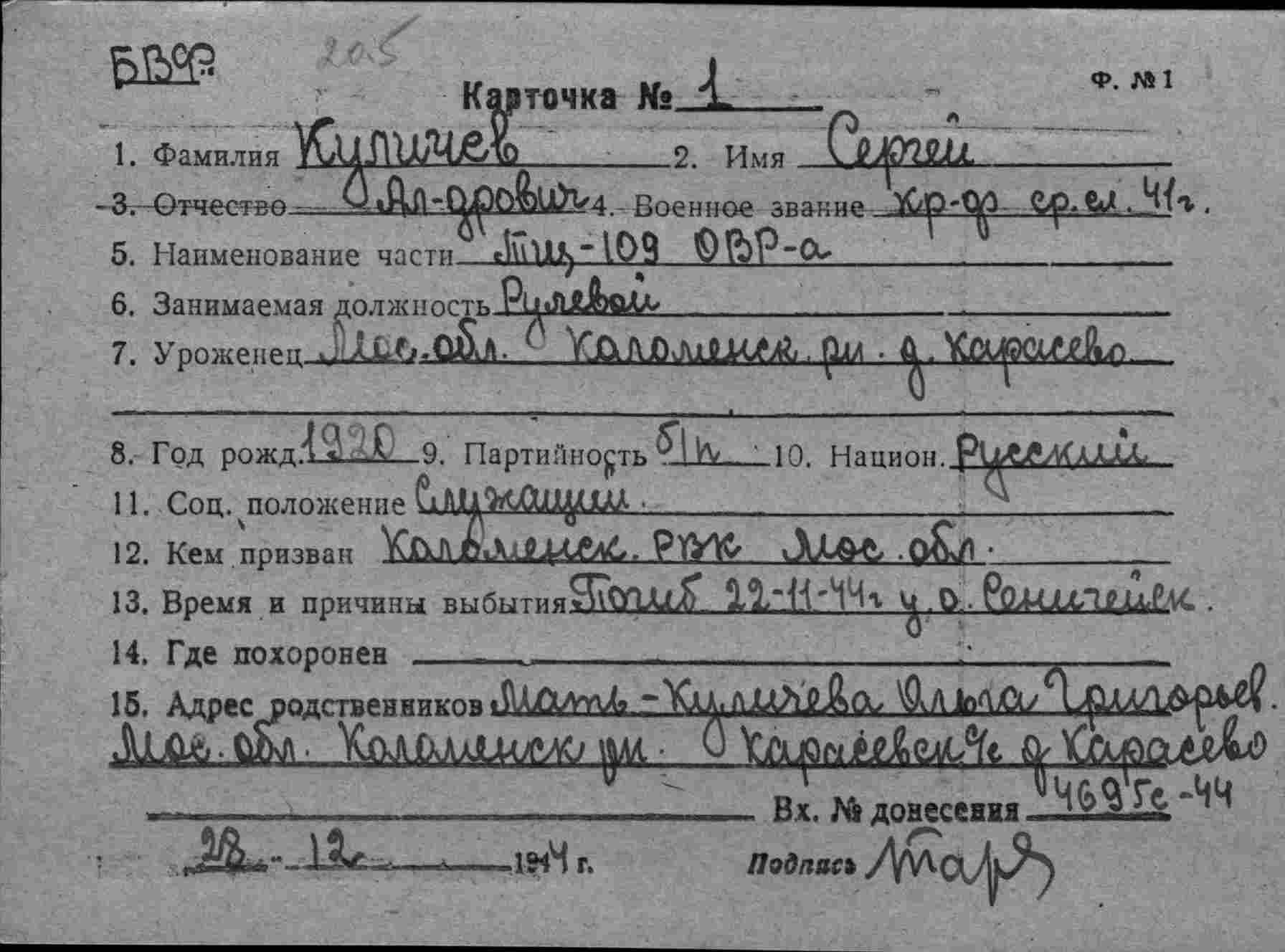 Место призыва Кагановичский РВК