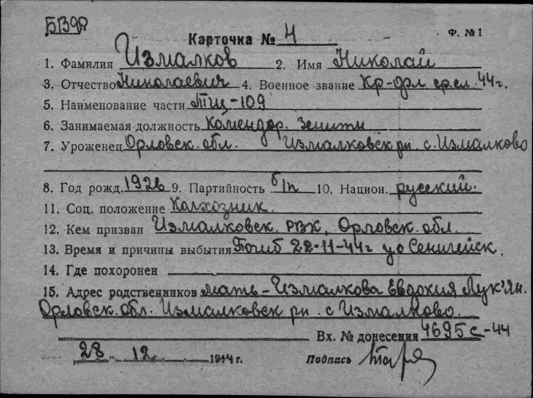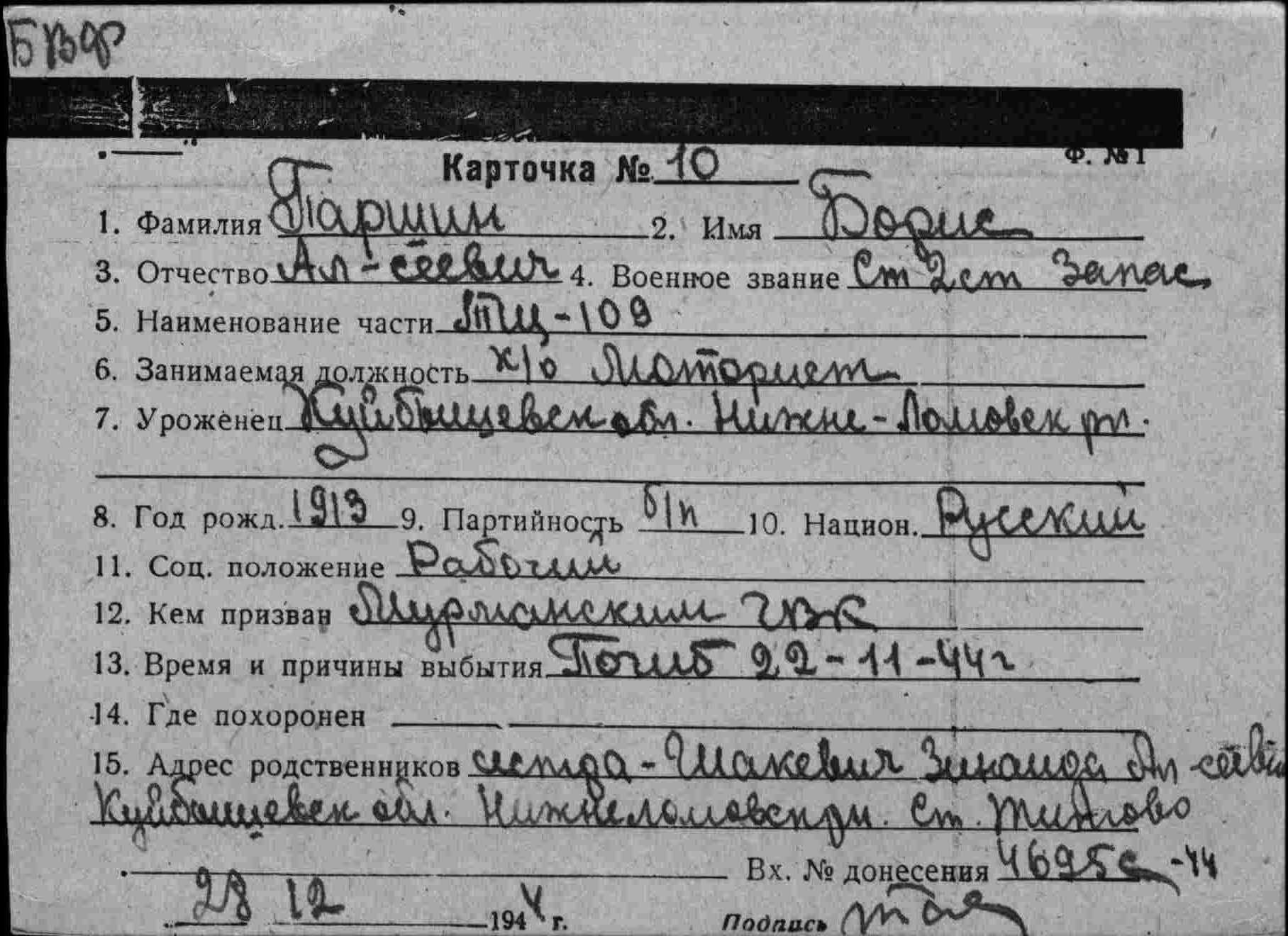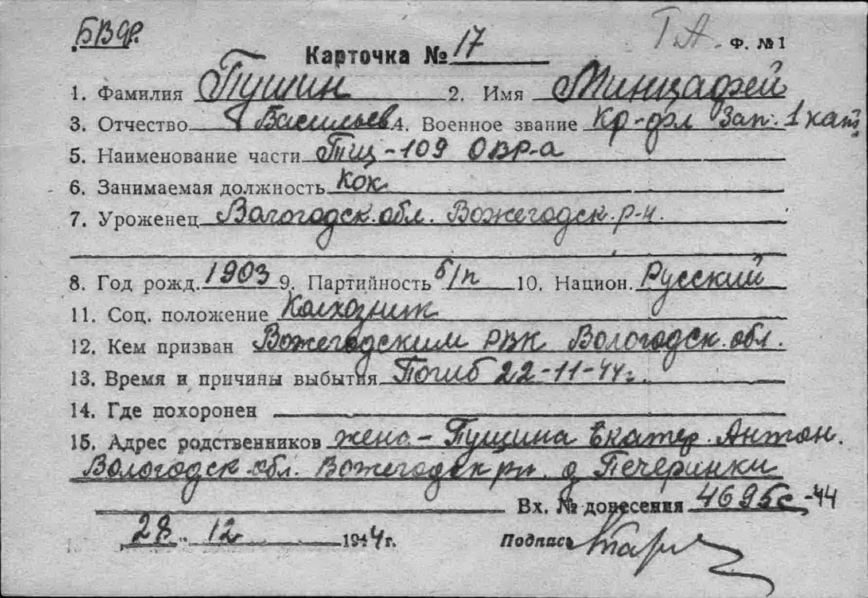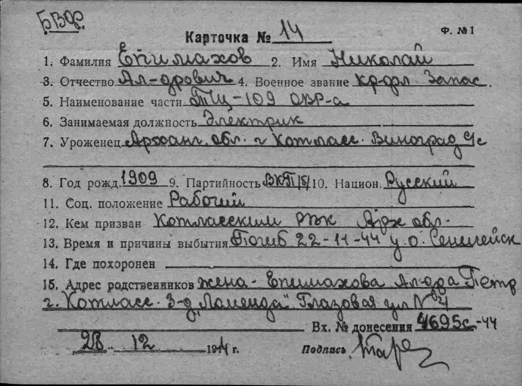 Дата выбытия 22.11.1944