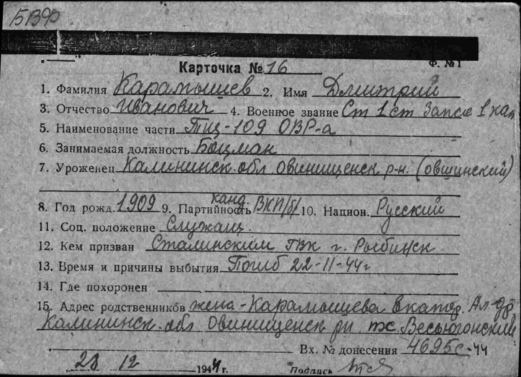 Место призыва Сталинский РВК, Ярославская обл., г. Рыбинск, Сталинский р-н