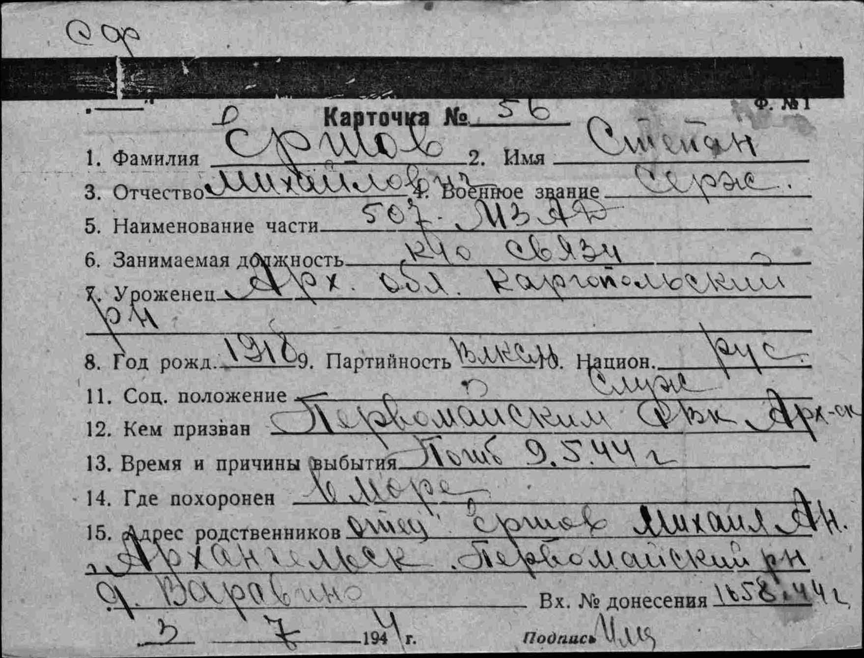 Дата и место призыва Молотовский РВК, Молотовская обл., г. Молотов, Молотовский р-н