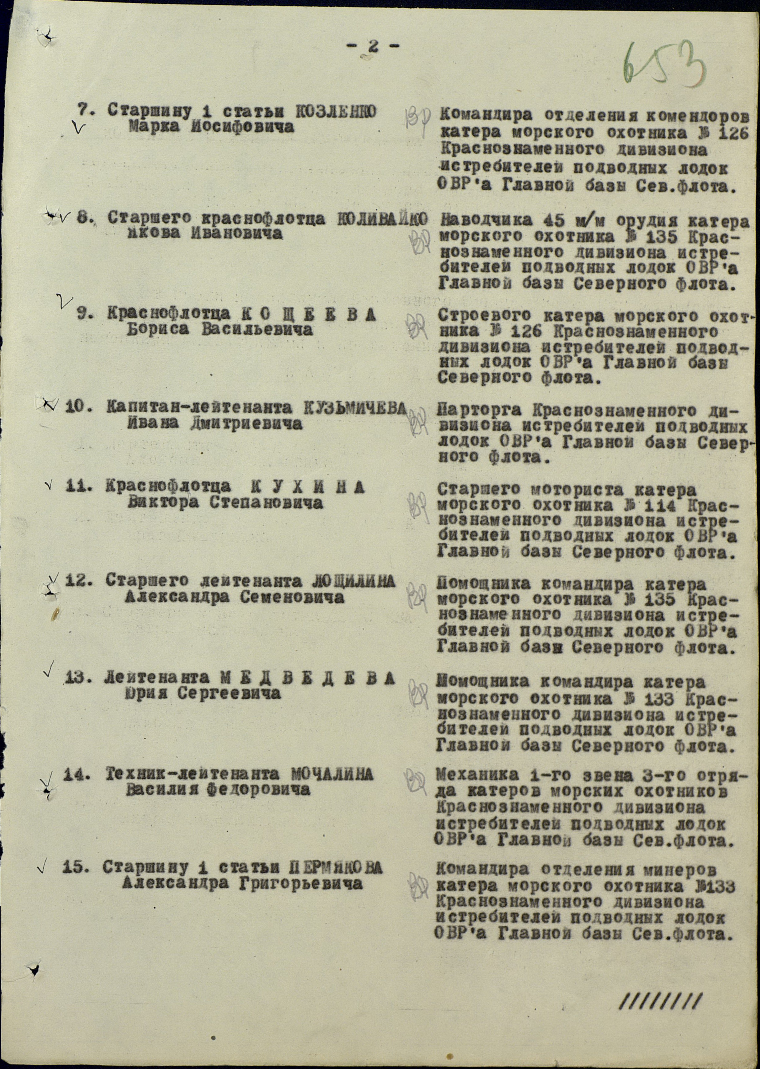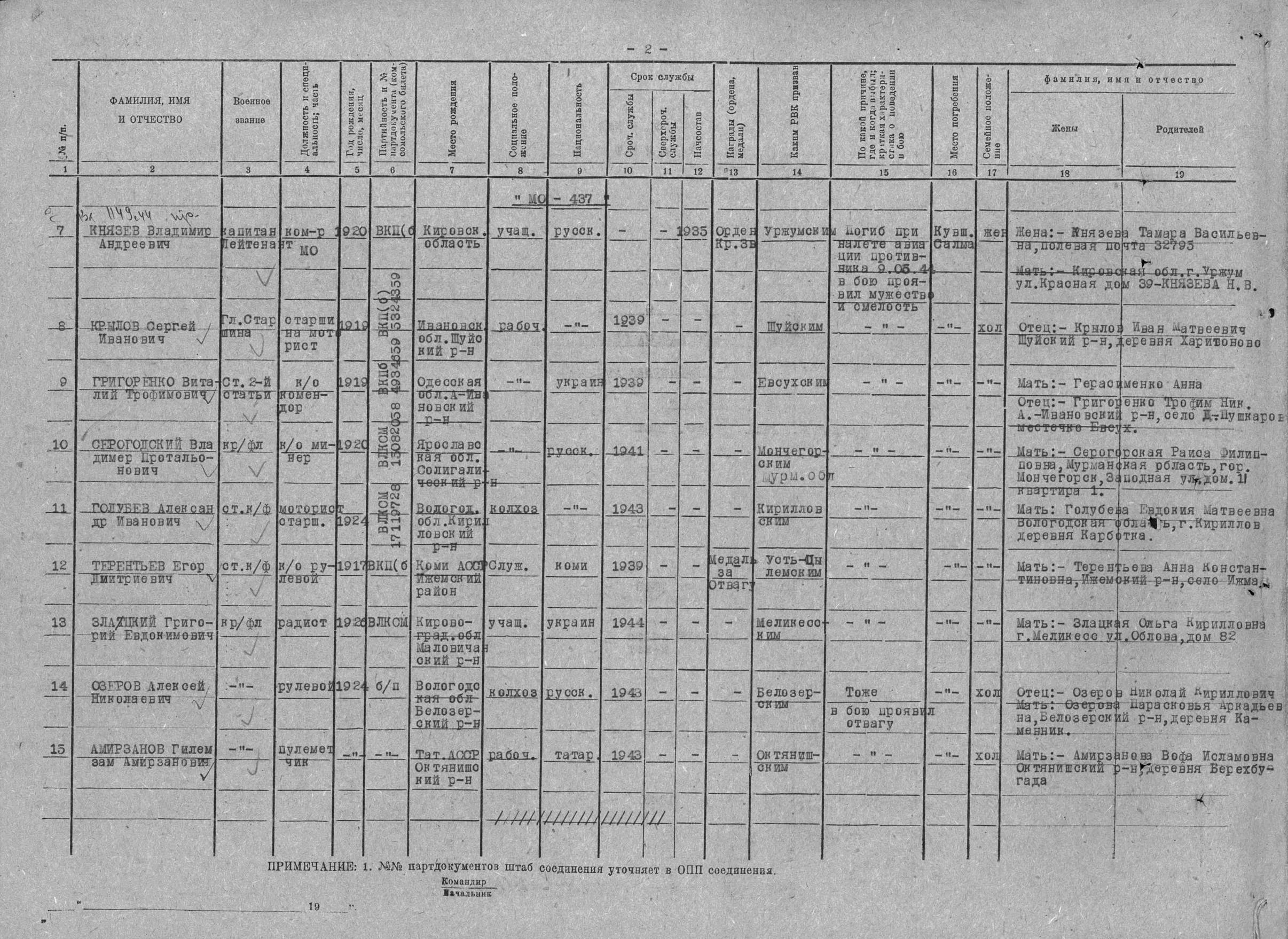 Список членов экипажа МО-435, МО-437, МО-439 БСКР ОВРа ГБ СФ погибших 9 мая 1944 г. при авианалете германской авиации в Кувшинской Салме