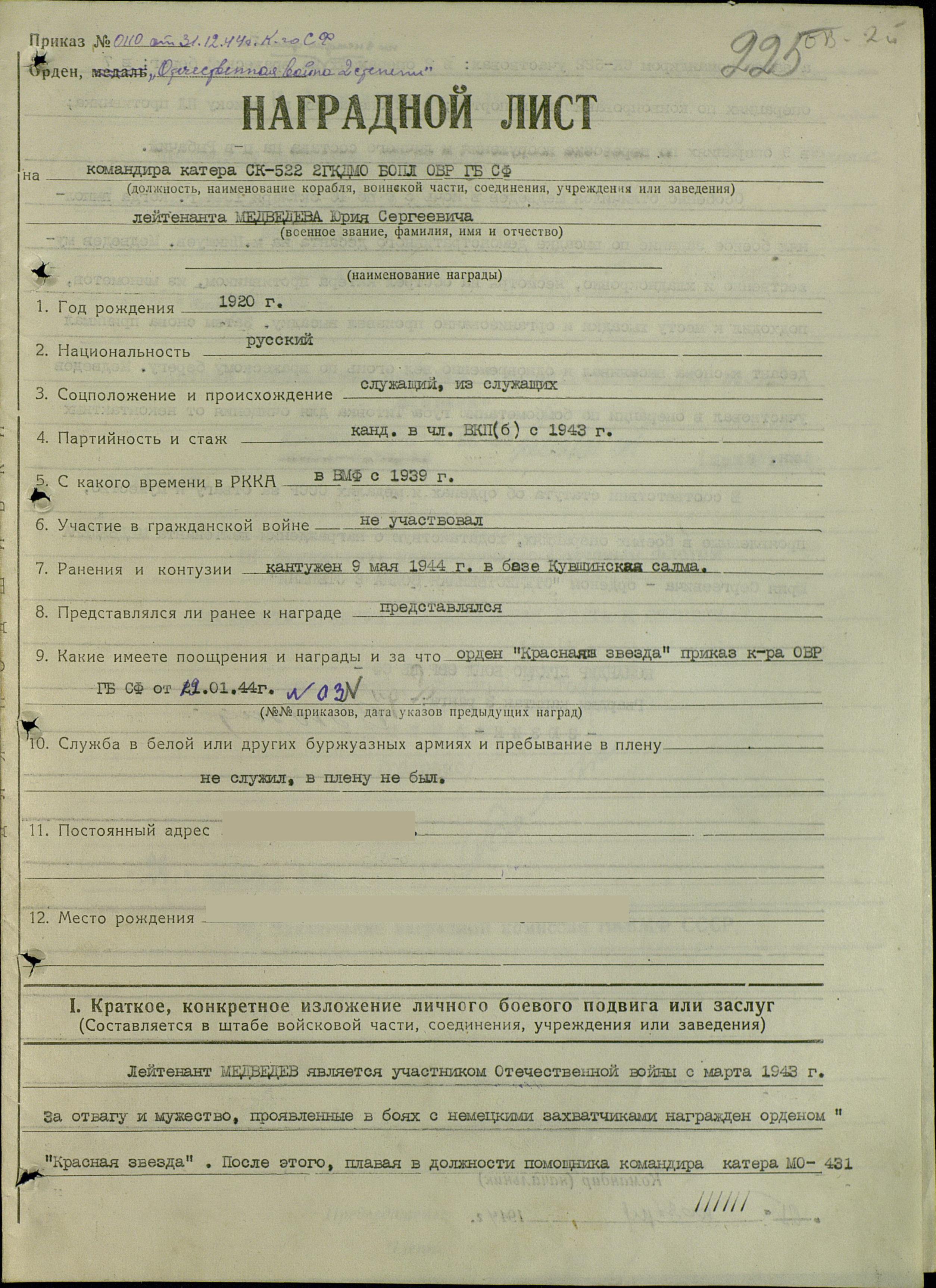 1, МЕДВЕДЕВ Юрий Сергеевич, лейтенант, МО-443