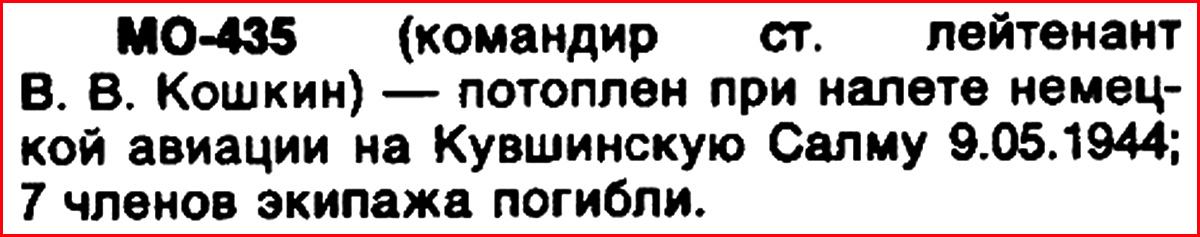 МО-435, МО-437, МО-439 и МО-443, потопленные 9 мая в Кувшинской Салме, стали единственными катерами этого типа, потерянными Северным флотом. Трудно сказать, было ли это простым совпадением или нечто большим, но уже в течение 21–25 мая все двадцать оставшихся катеров были сначала переведены в Архангельск, а затем оттуда по внутренним водным путям и железной дороге переброшены на Черное море.[102]